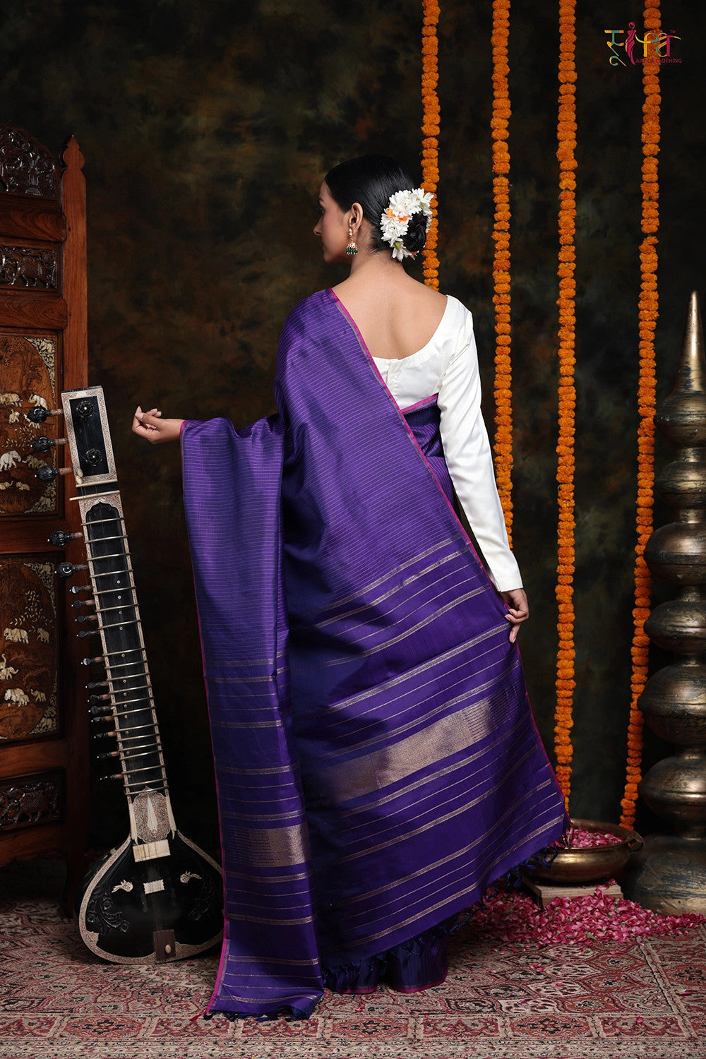 Grape Violet Handloom Kanchipattu Saree With Silver Stripes