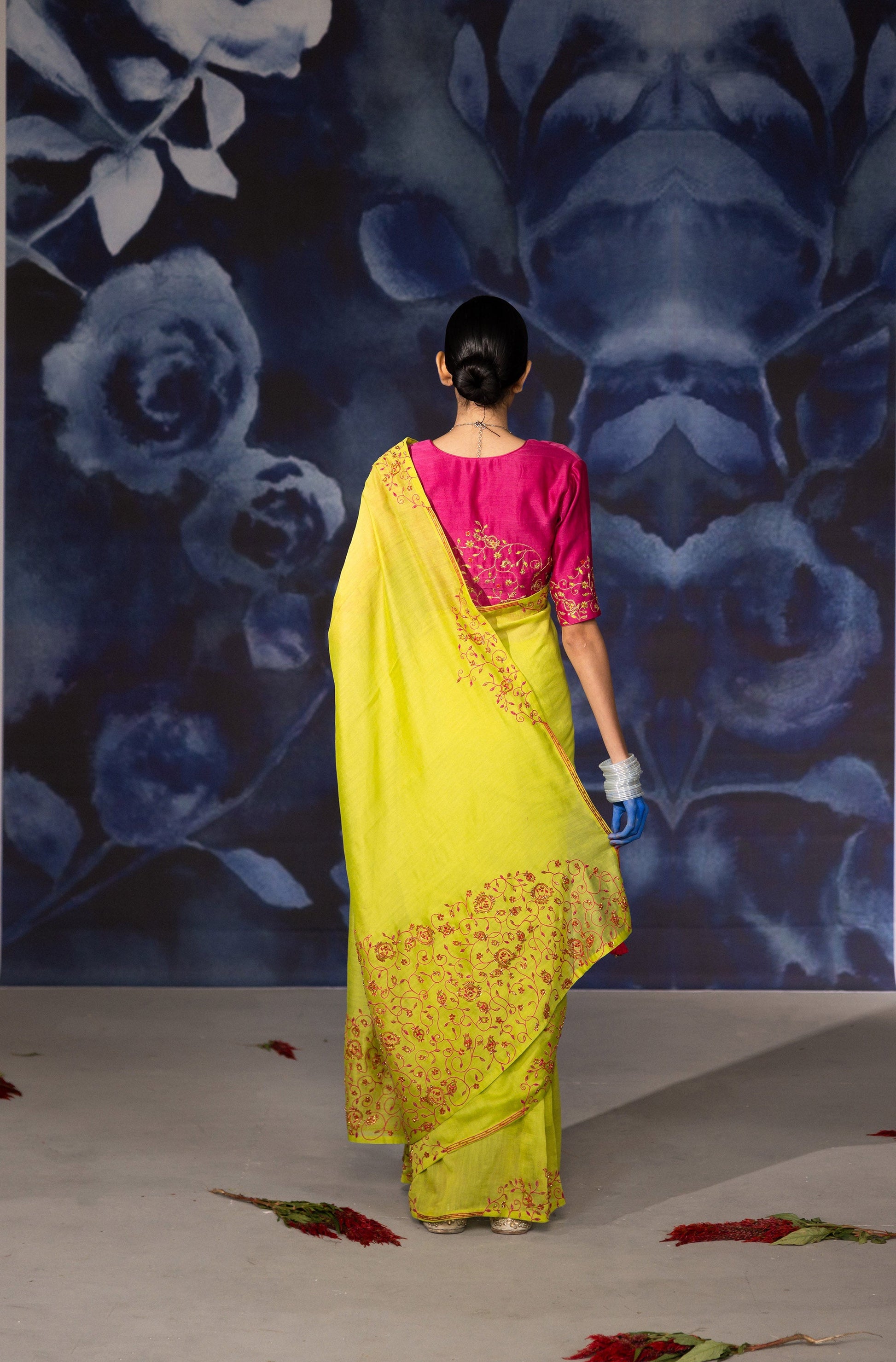 Green and Pink Chanderi Hand Embroidered Vastralekha Saree