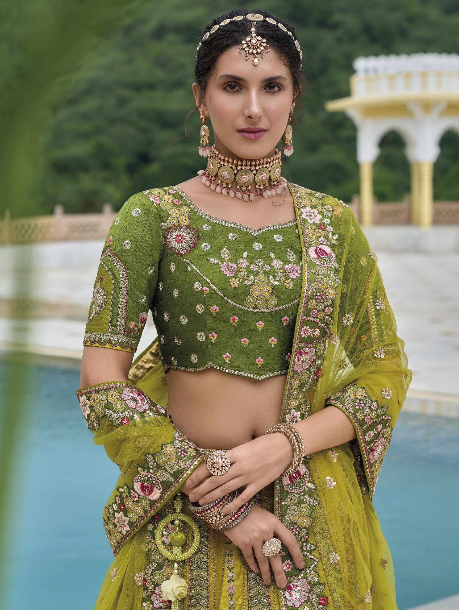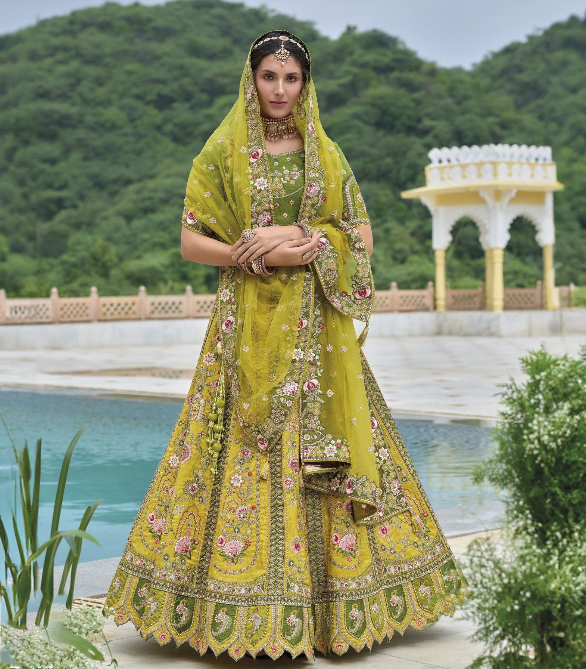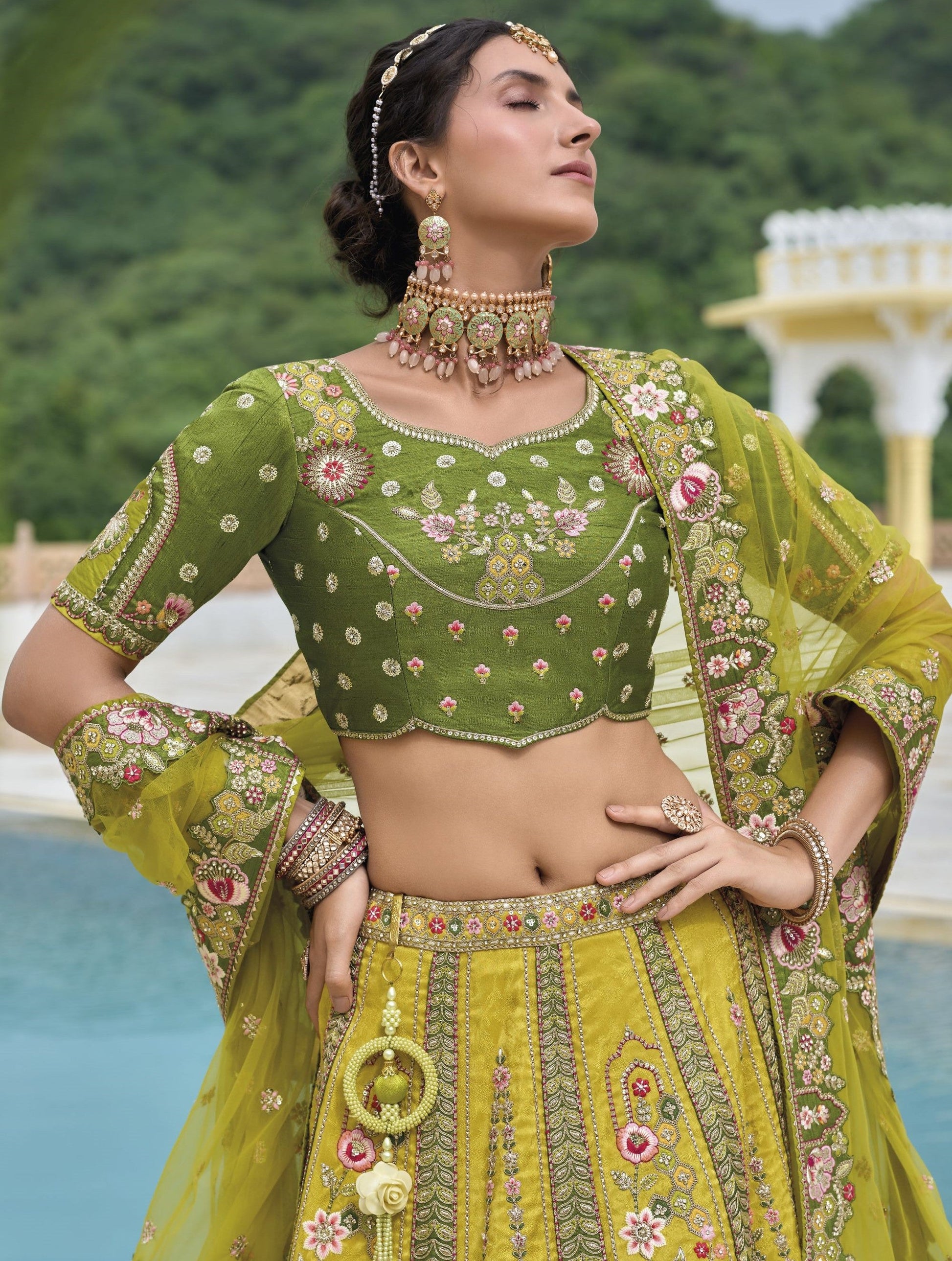 Green and Yellow Sequins and Floral Embroidery Silk Mehendi Lehenga