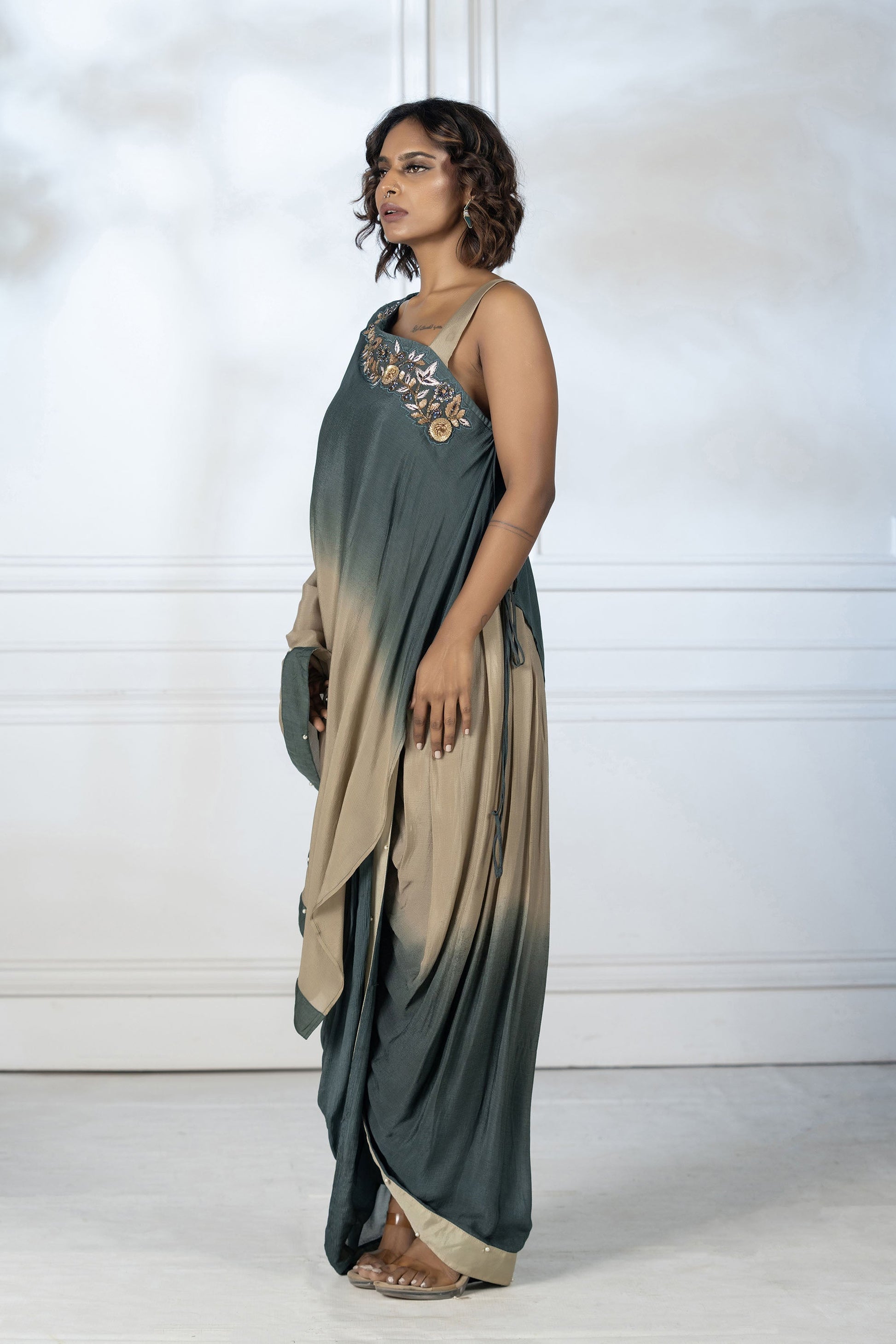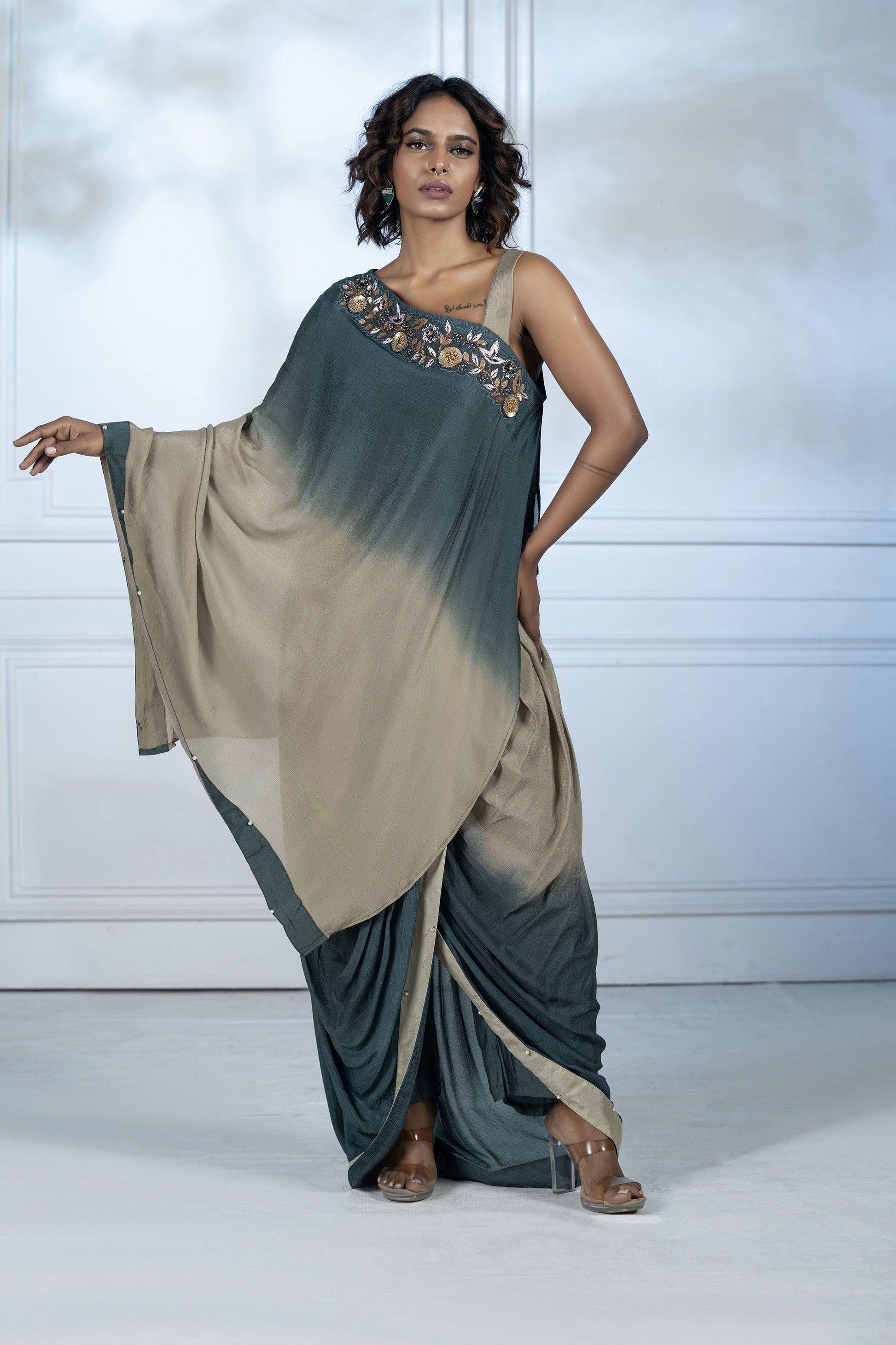 The outfit has an asymmetrical one-shoulder design ,giving it a elegant & traditional drapery.The neckline is adorned with ornate embroidery of metallic & sequence work.