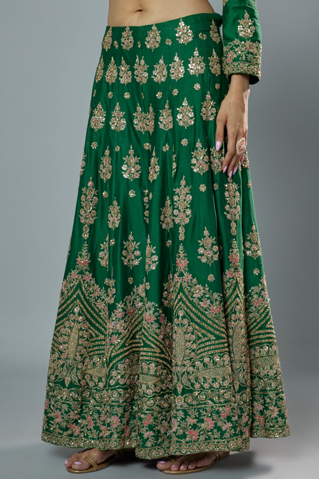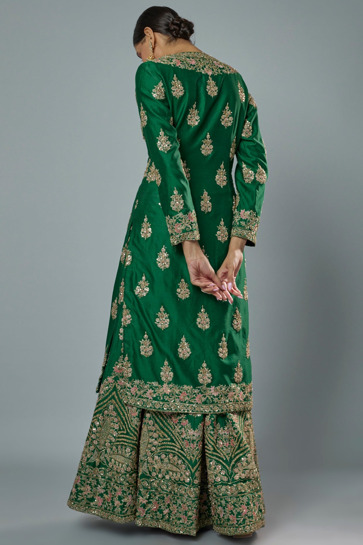 Featuring A Green Kurta In Chanderi Base With Resham And Sequins Embellishments. It Is Paired With Matching Machine Embroidered Sharara Pants And An Organza Dupatta. Perfect For Festive Occasions Or Pre-Wedding Ceremonies.