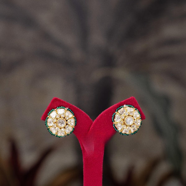 Elevate your look with these exquisite Green Flower Polki Earrings. Handcrafted with sterling silver and finished with gold plating, these gracefully designed studs are set with sparkling Moissanite polkis and enhanced with pearl beading for a timelessly elegant finish. The secure twisted screw fastening and omega clasp make these earrings a perfect jewelry piece for special occasions.