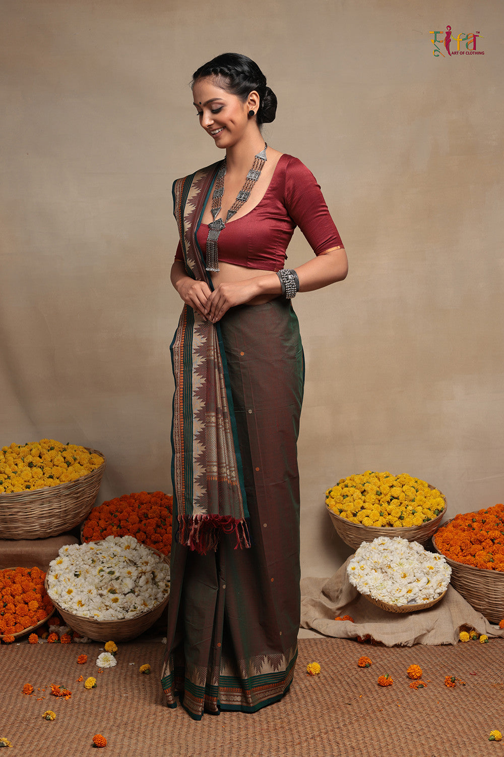 Presenting our new delightful green handloom pure cotton Kanchi saree adorned with an exquisite Temple Border in striking beige. Meticulously crafted with precision and an eye for detail, this saree embodies a perfect blend of elegance and sophistication.Drawing inspiration from the intricate motifs found in ancient temples, the intricate Temple Border in beige adds a touch of traditional allure, symbolizing the rich heritage of Indian craftsmanship. Every detail is thoughtfully woven, adding a touch of artistic splendor to this saree.Versatility meets beauty as this saree effortlessly blends tradition with contemporary sensibilities.