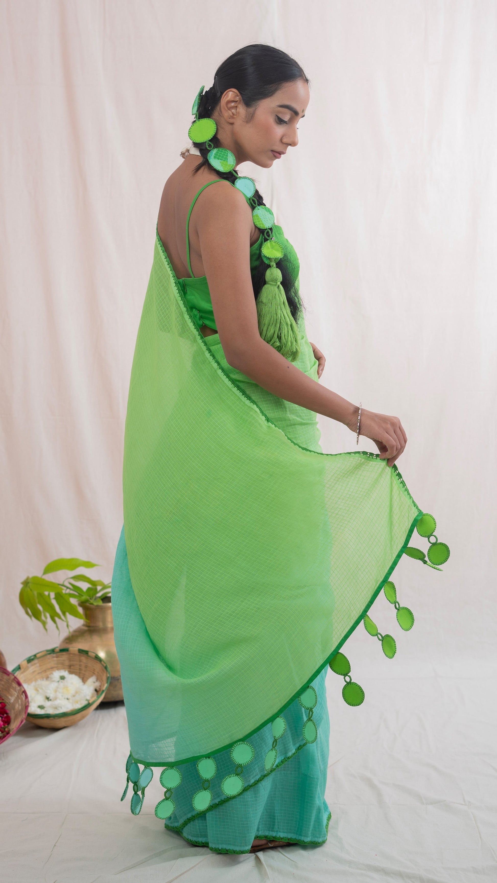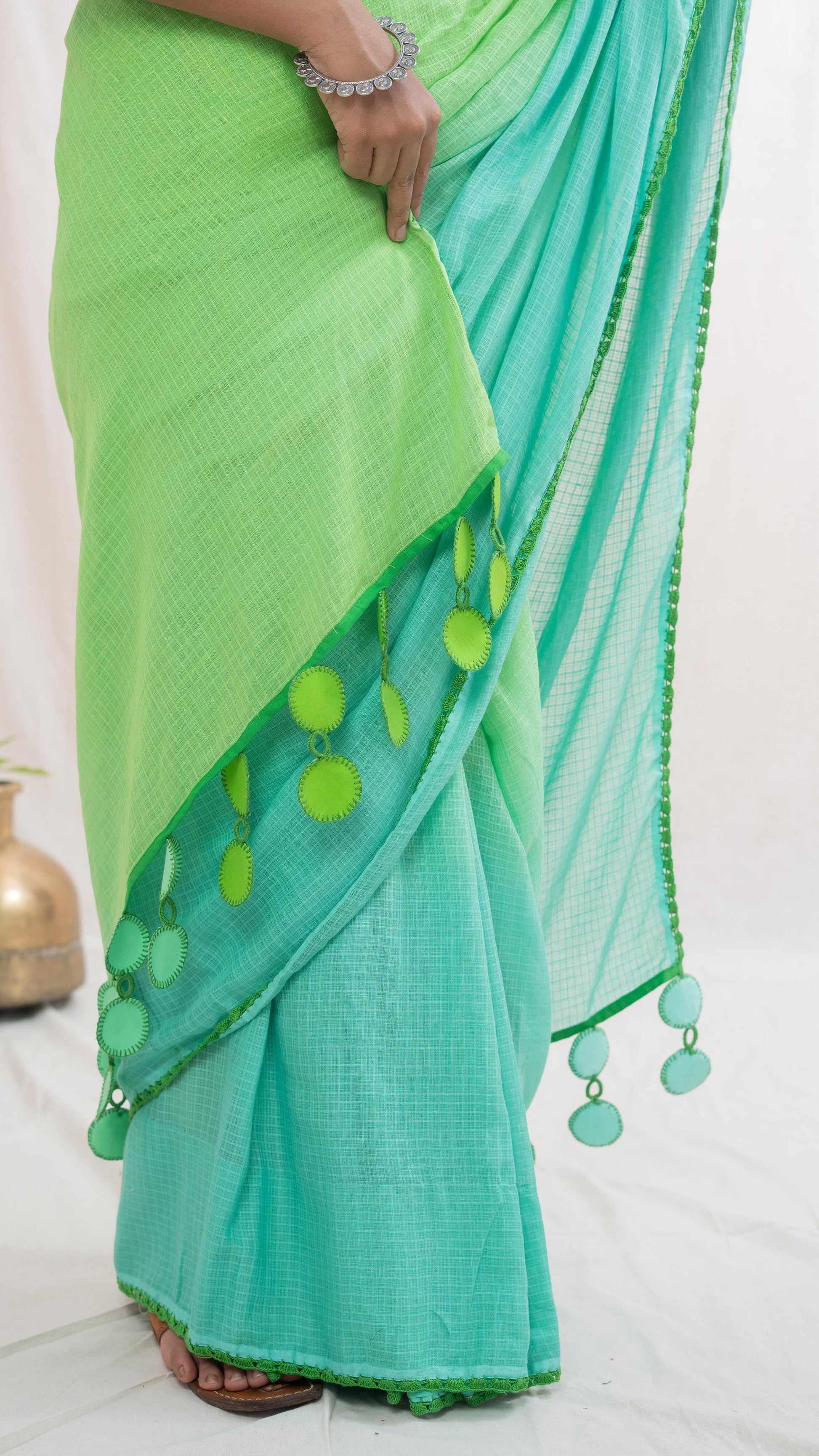 Step into a world of elegance with our Green मल्लिका Saree, a true embodiment of grace and sophistication. Made from sheer Kota Cotton with a distinctive checkered weave, this saree offers both breathability and a delicate texture.