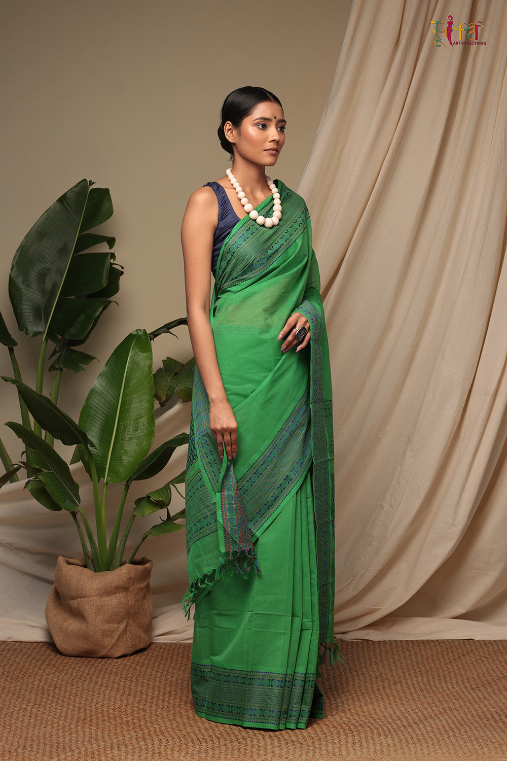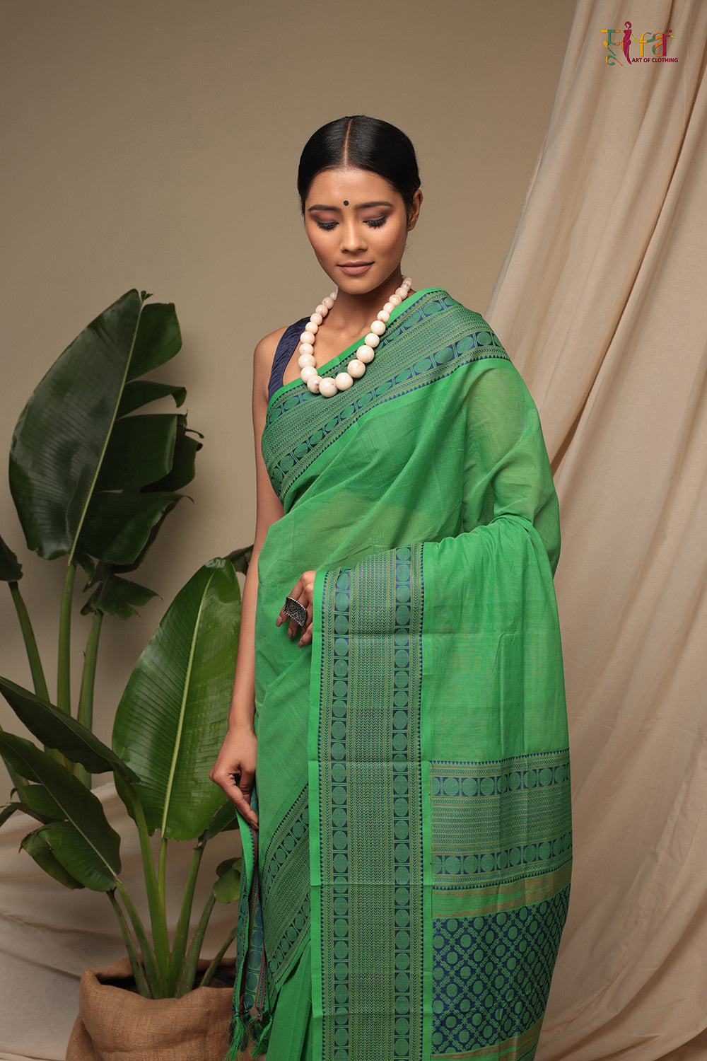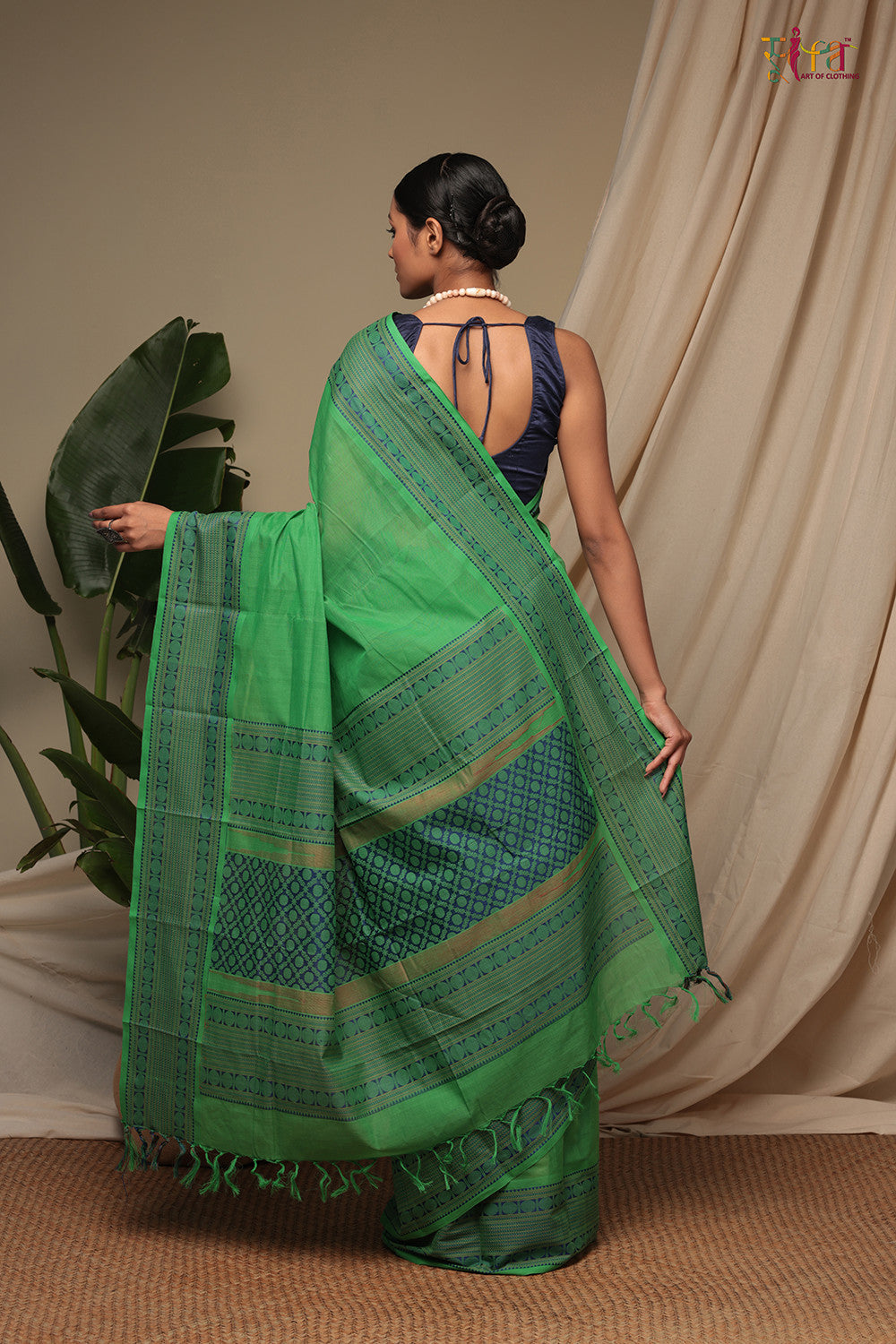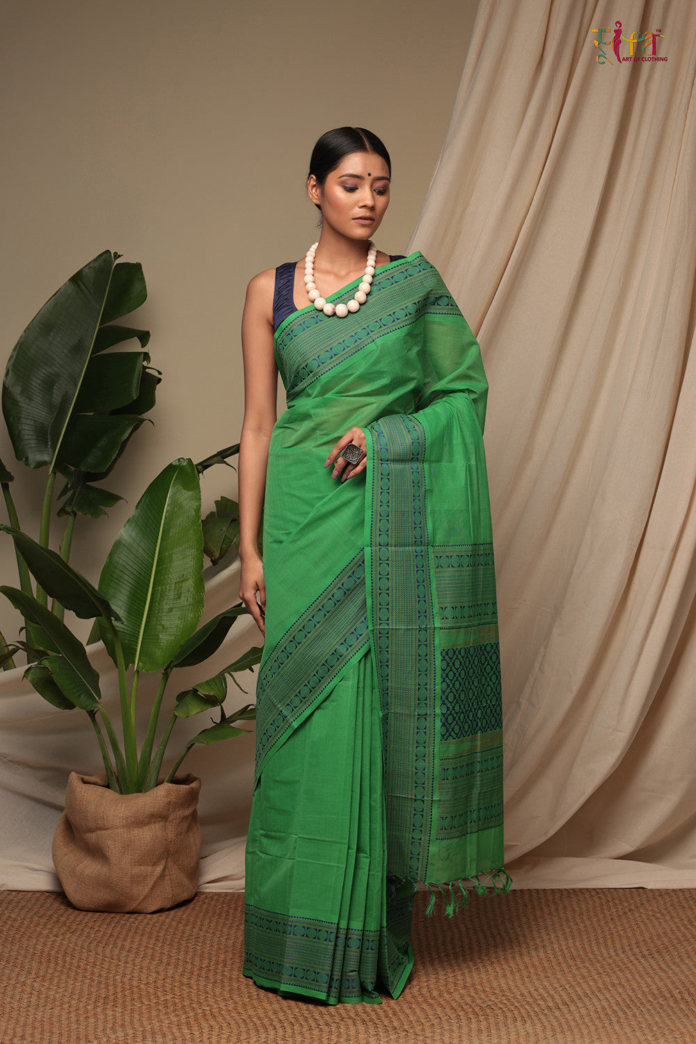 Experience our exquisite Handloom Pure Cotton Fern Green Saree, enhanced with a beautifully intricate border. Meticulously crafted, this saree displays a sophisticated Fern Green shade that radiates elegance. Made from pure Cotton fabric, it envelops you in comfort while adding a touch of refinement to your ensemble. Every stitch weaves a tale of tradition and meticulous artistry, resulting in a mesmerizing visual display. With its timeless versatility, this saree effortlessly suits any occasion, whether it's a festive celebration or a formal gathering. Enter a realm where tradition meets grace and allow your style to make a resounding statement.