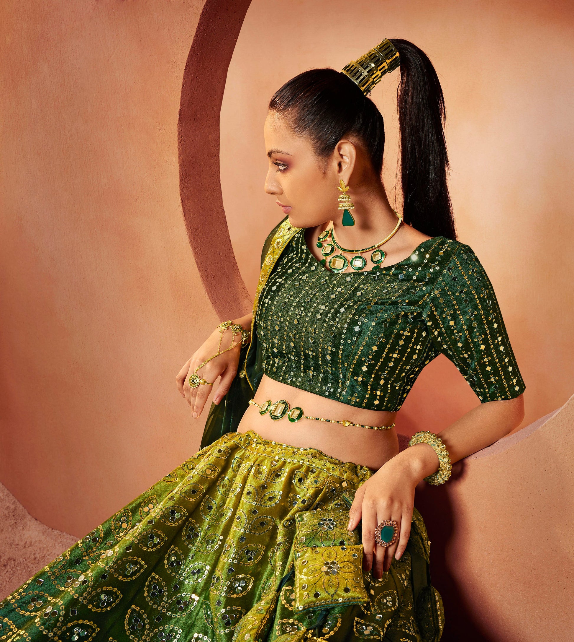 Looking for something a little out of the ordinary? We've got just the thing! This Green Velvet Sequence Work Lehenga is perfect for those who want to make a statement. With its beautiful sequins embroidery and vibrant Green color, this lehenga is sure to make you the center of attention. A bridesmaid would look gorgeous in this outfit. It is suitable for any occasion, such as wedding receptions, engagement parties, and sangeets. So don't wait any longer, add this Green Color Velvet Sequence Work Lehenga to your wardrobe today!
