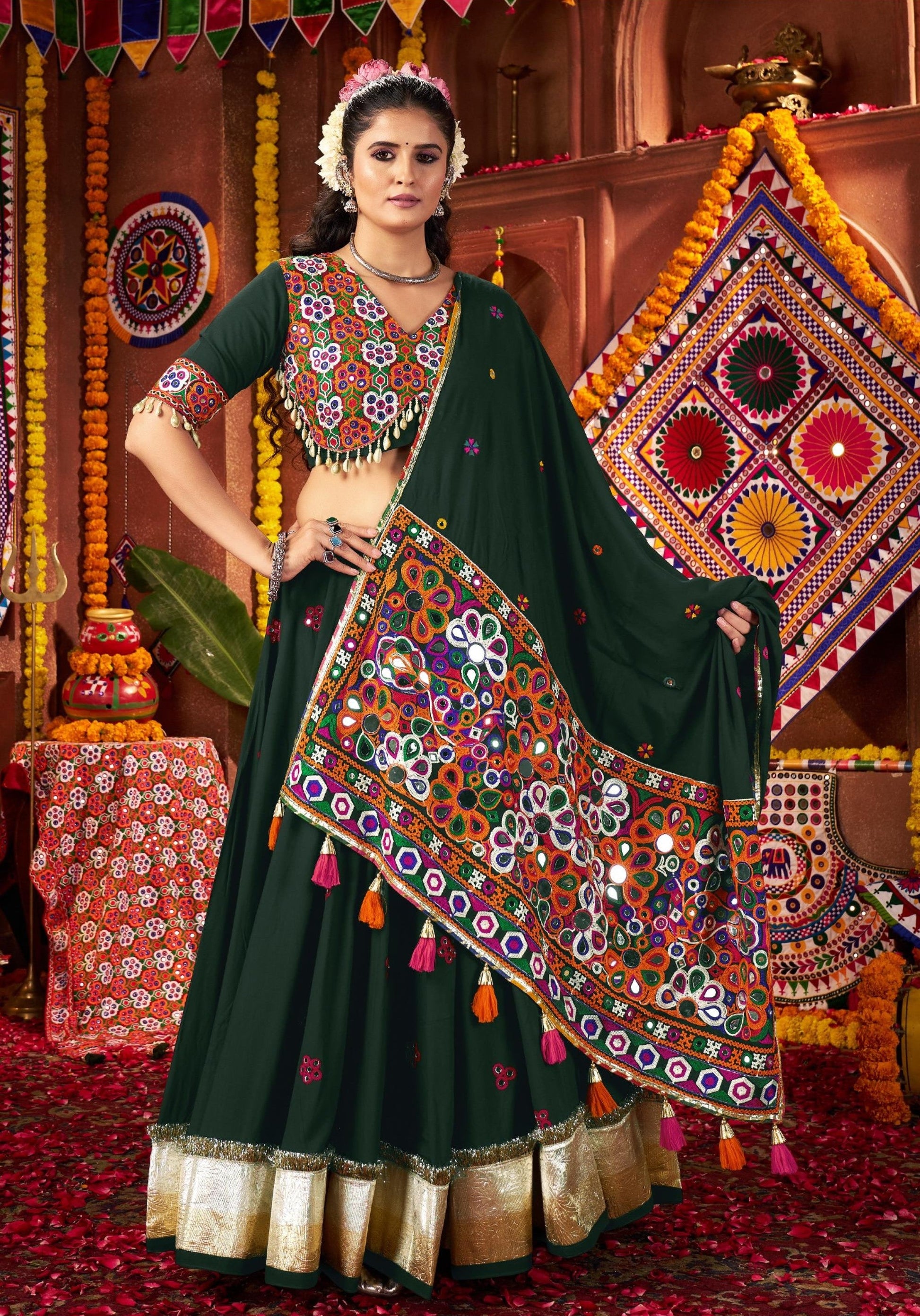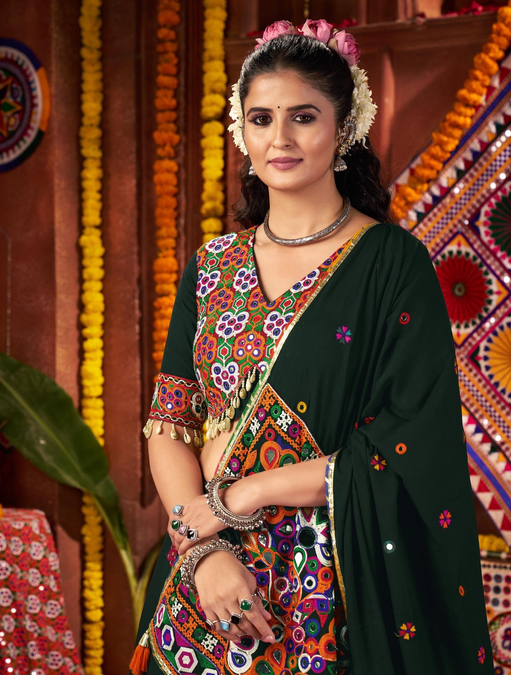 Green Viscose Cotton Print Jacquard Kutchi & Mirror Work Navratri Lehenga