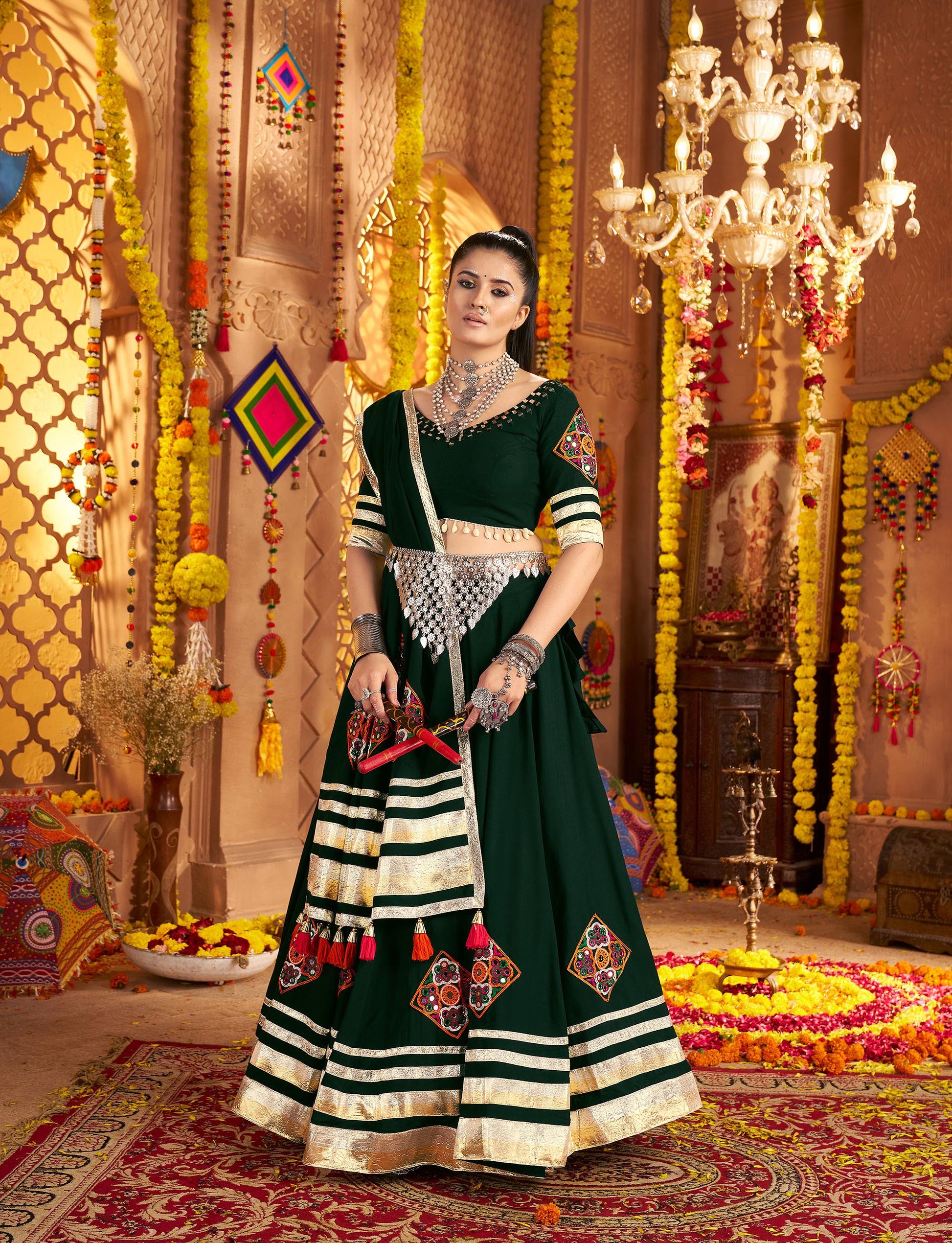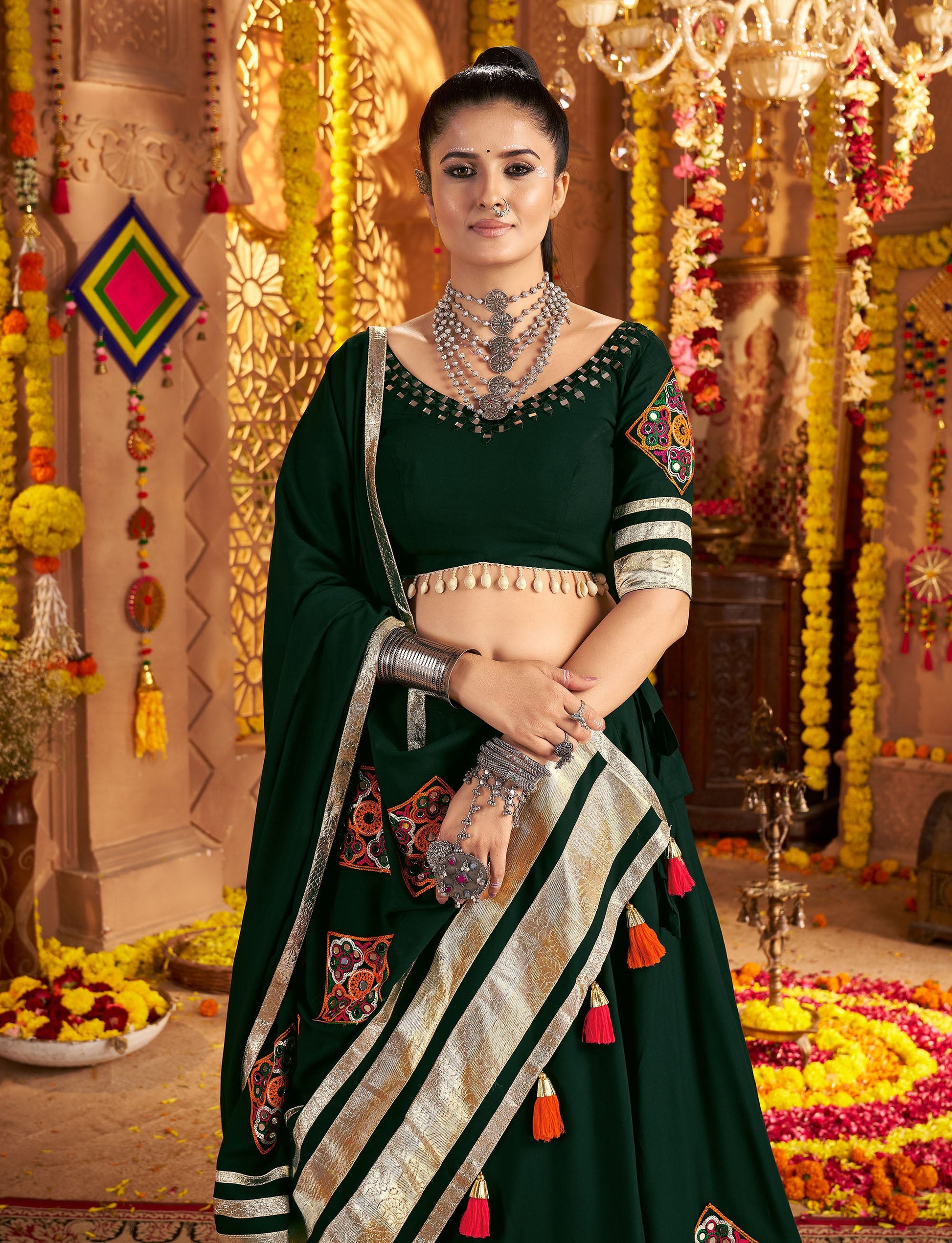 Green Viscose Rayon Hand Mirror Work Navratri Chaniya Choli