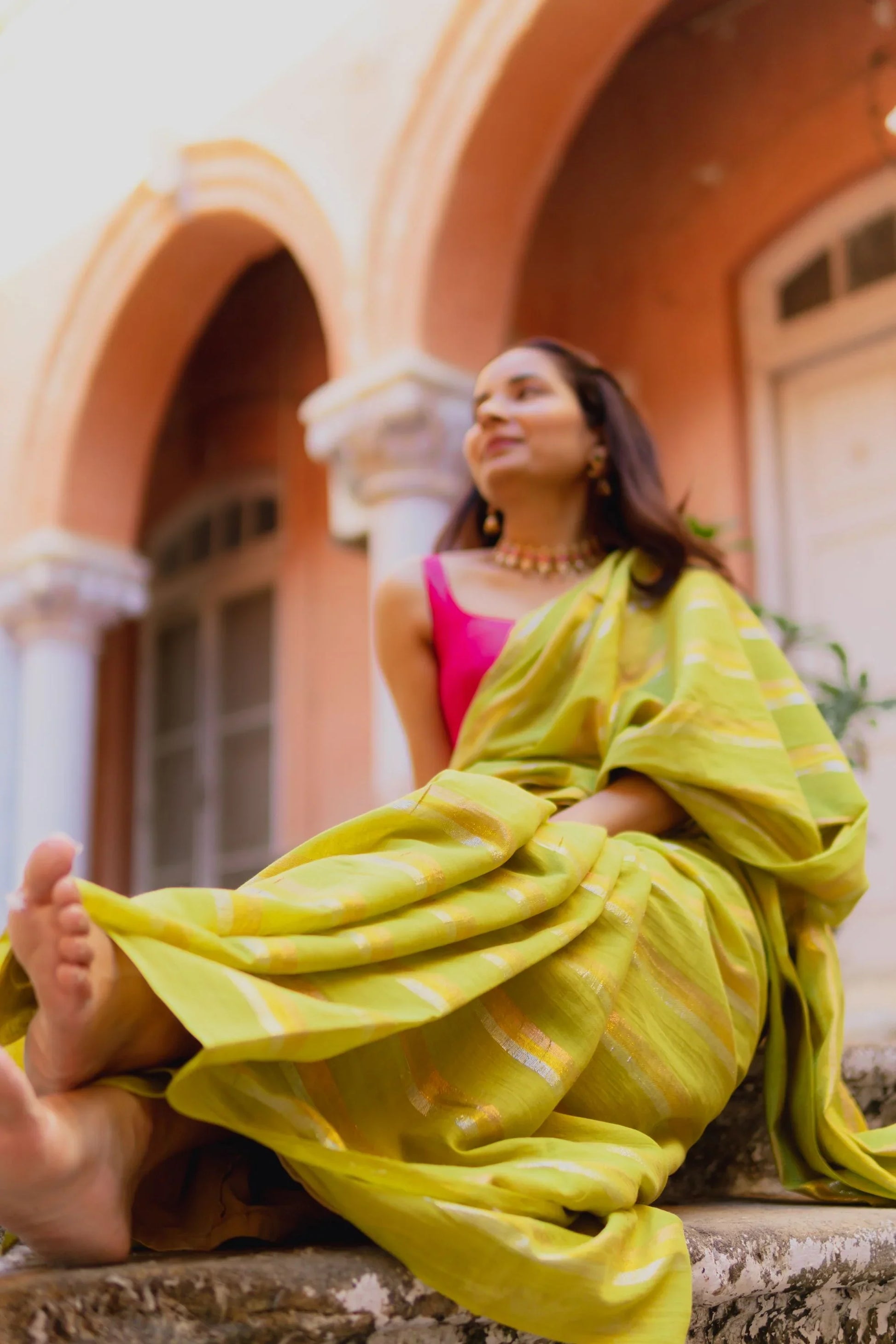 This saree is in cotton mulmul fabric with silver and gold lurex stripes. Saree has pink color tassels at the pallu to enhance the look. Saree fabric is soft and flowy. Its very easy to drape, perfect for any occasion.