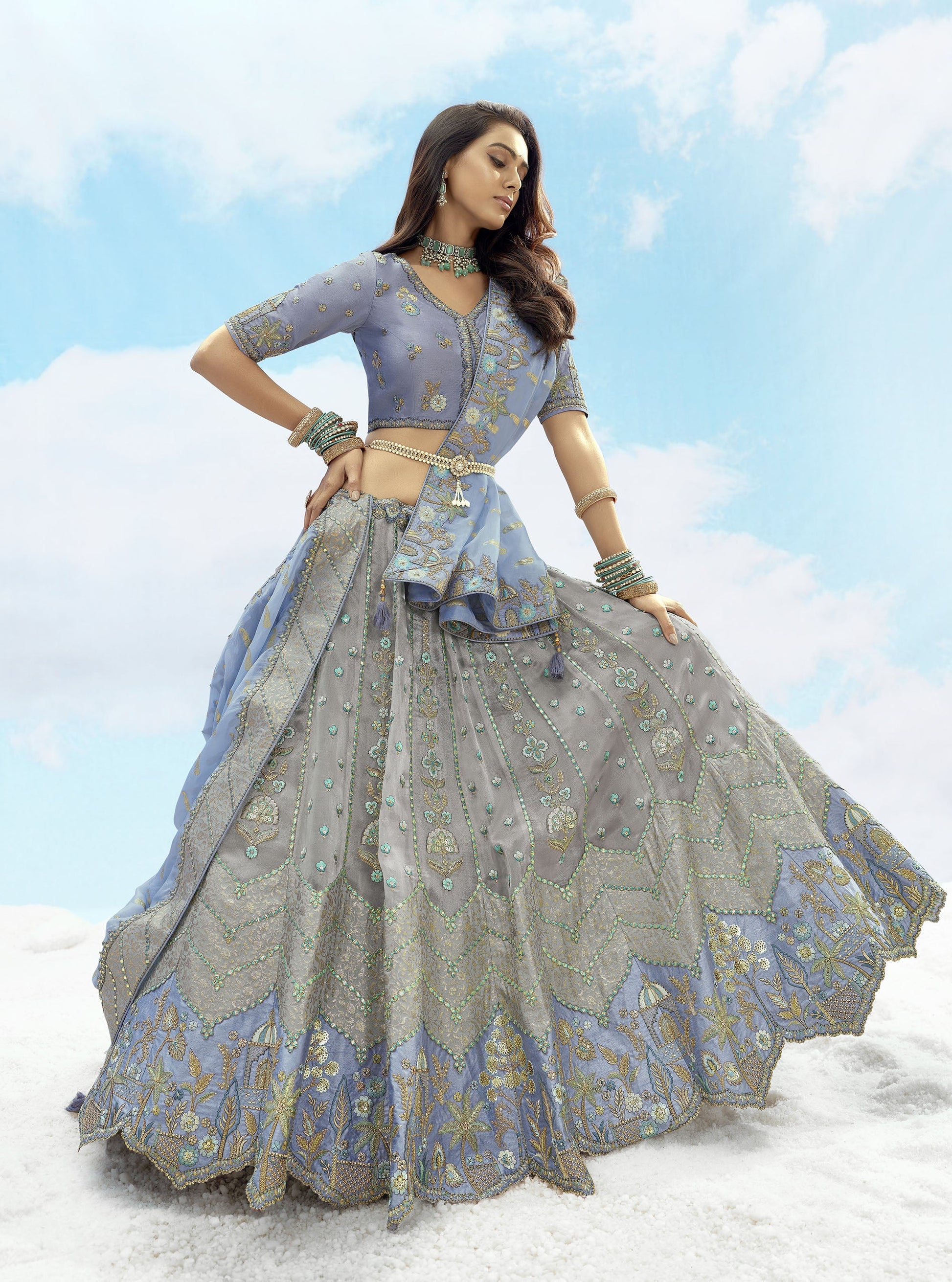 Grey and Blue Art Silk Jacquard Resham, Zari Embroidery Lehenga