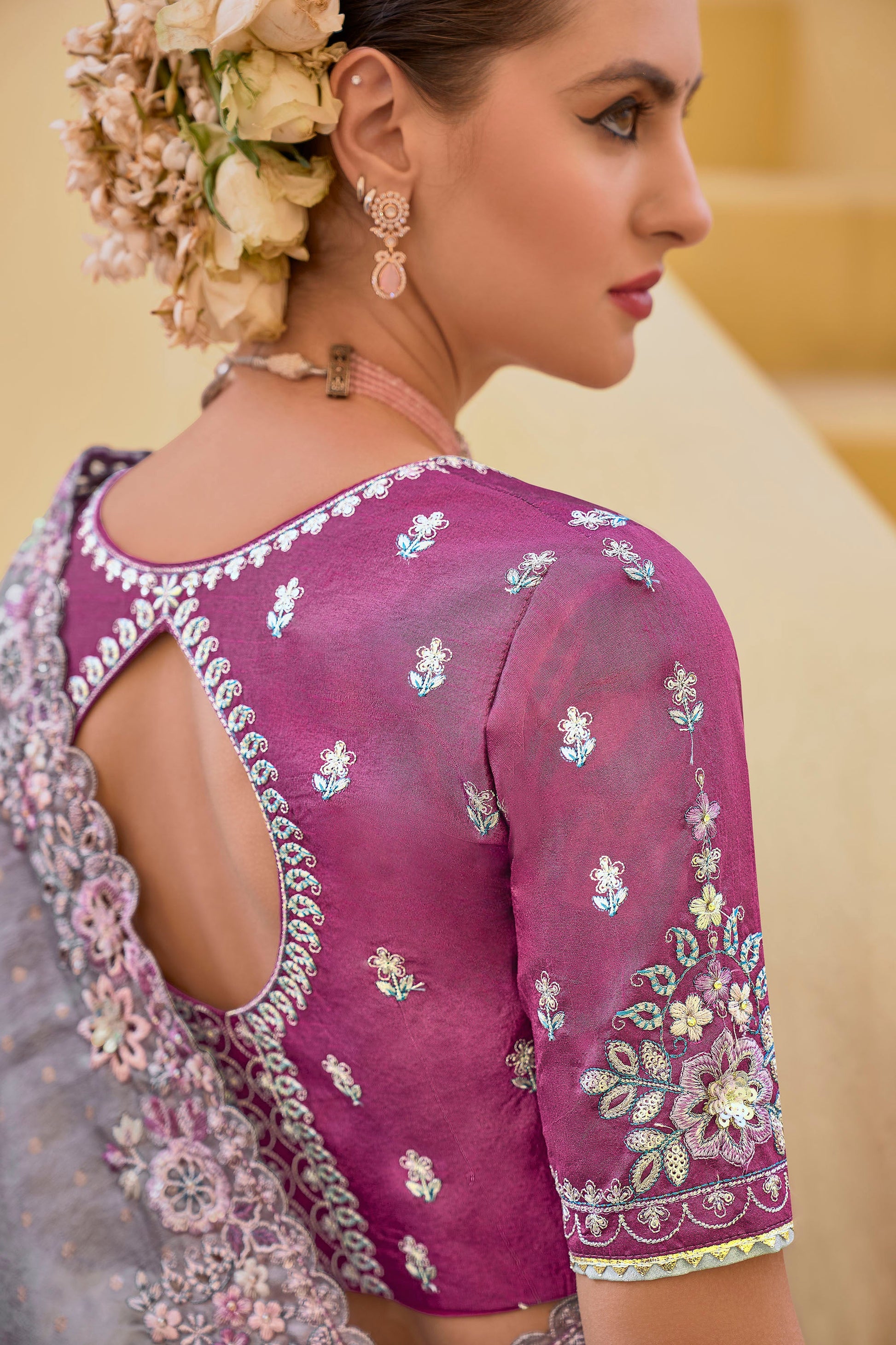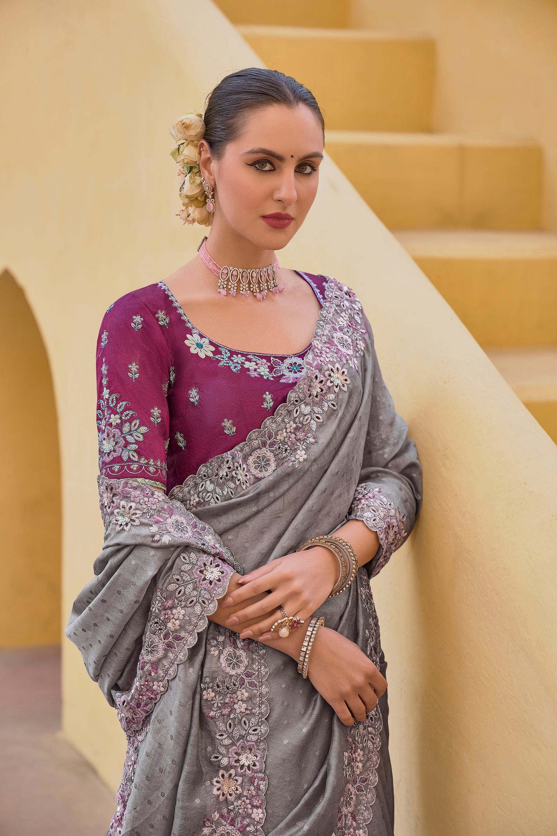 Are you seeking something exclusive? We've got what you require! This Grey Art Silk With Stone & Cut Work Saree with its gorgeous stone embroidery , cut work and grey, color is the perfect option for those seeking to make an impact. You will certainly be the center of attention in this Saree if you wear it to a wedding reception, an engagement party, or a sangeet. Pictured here is a bridesmaid wearing the Grey Art Silk With Stone & Cut Work Saree, which you can purchase today!