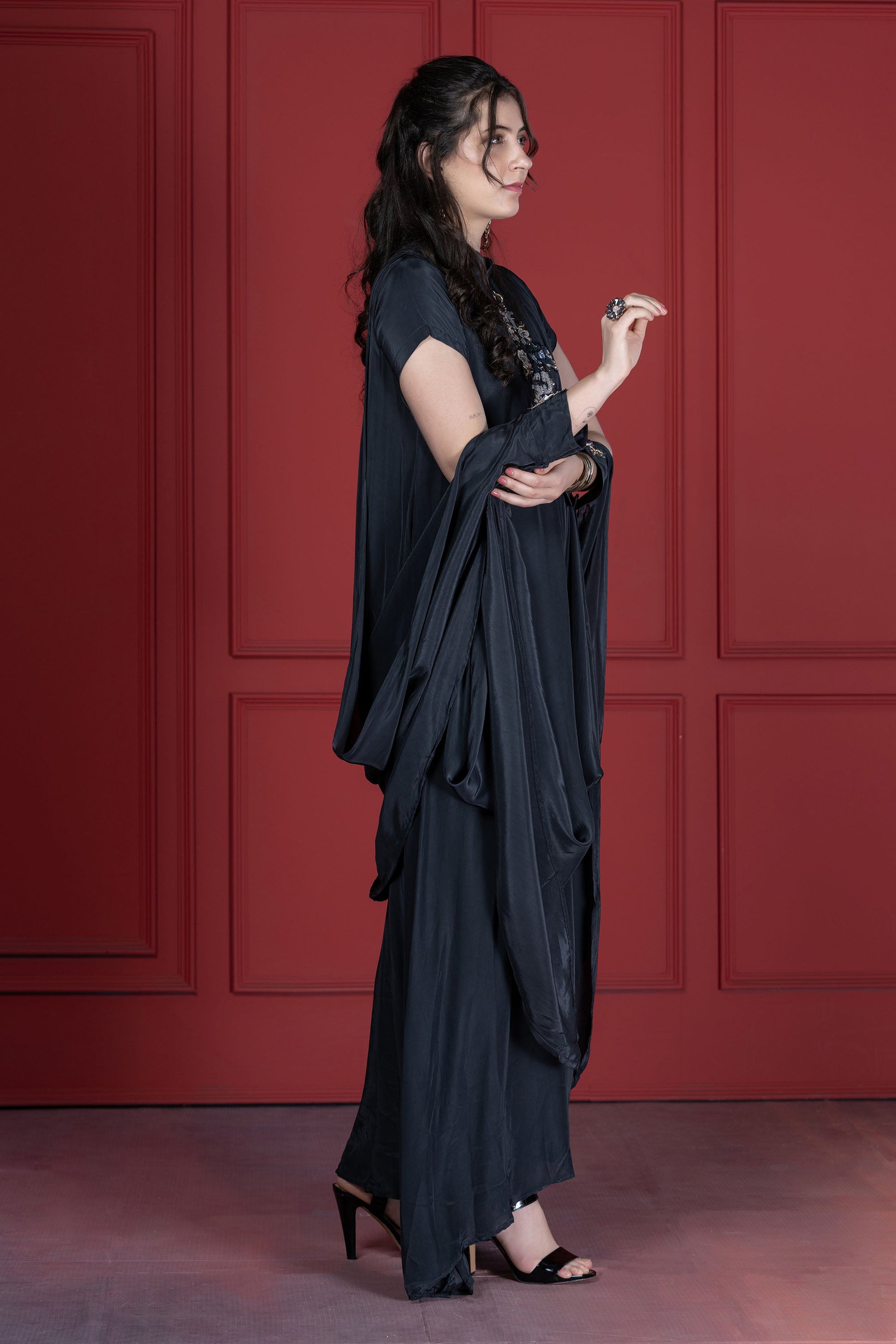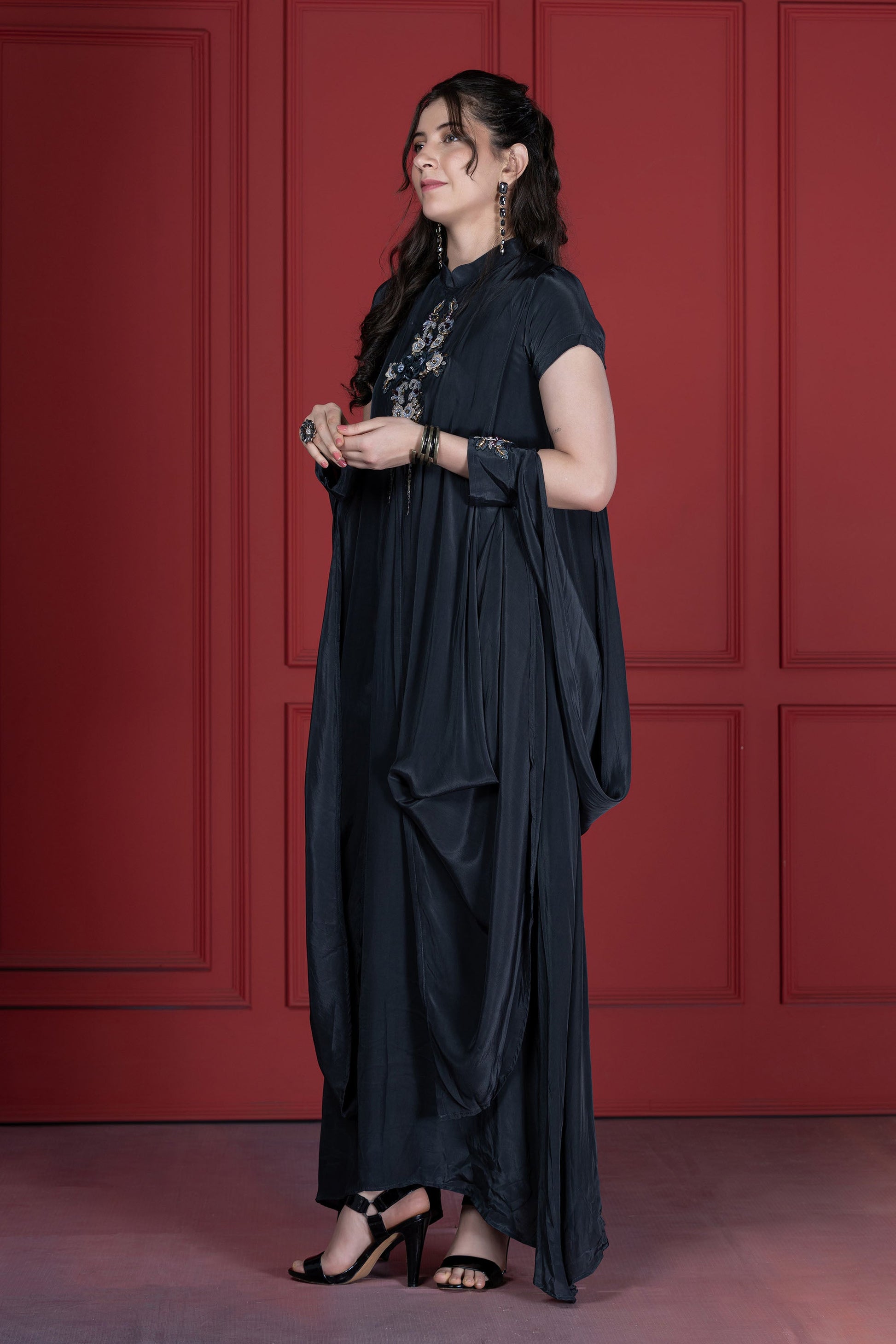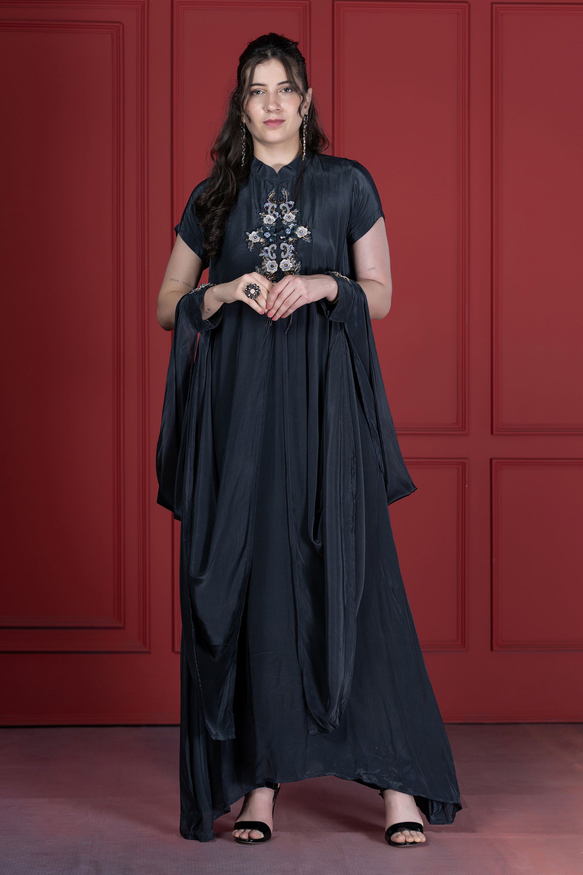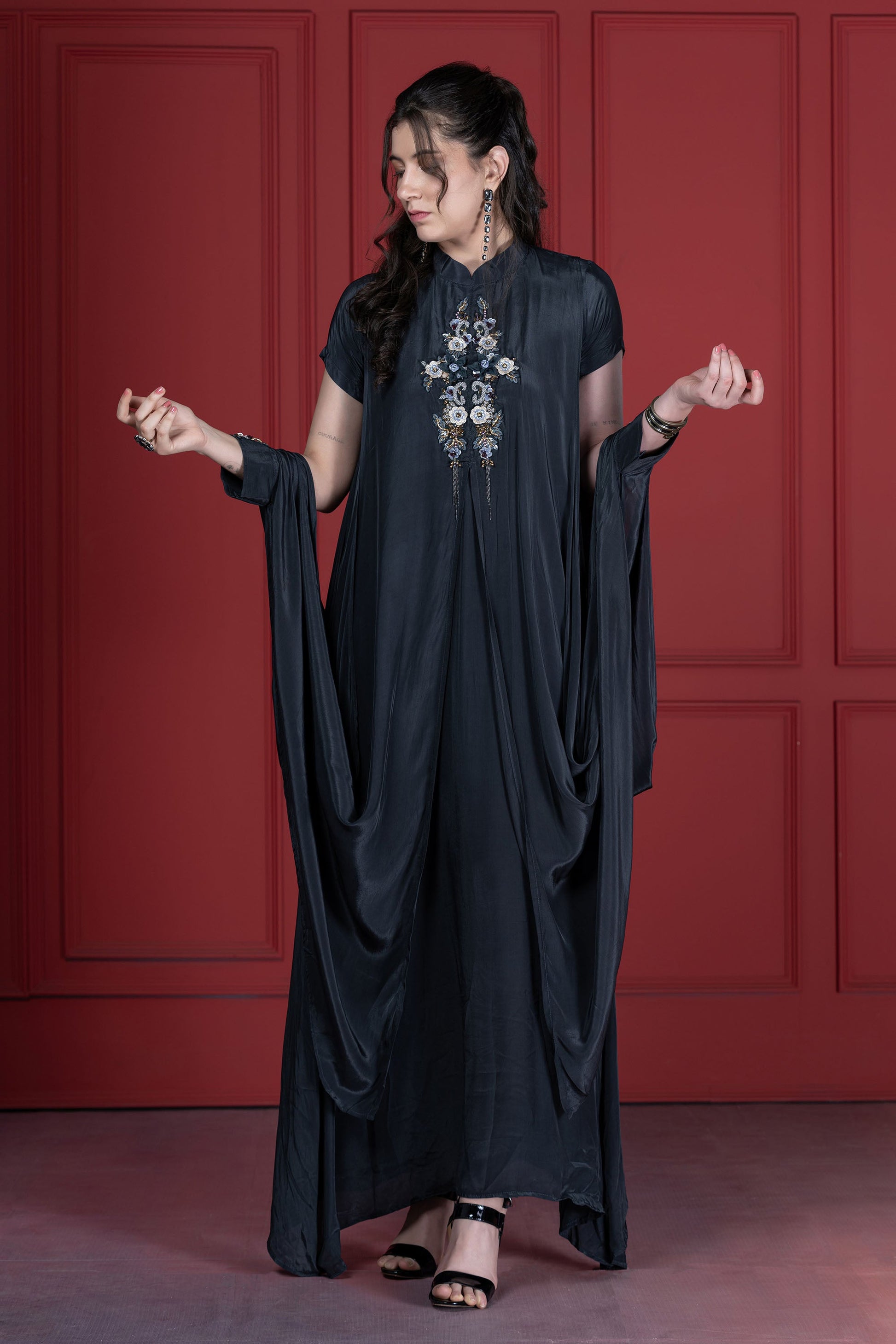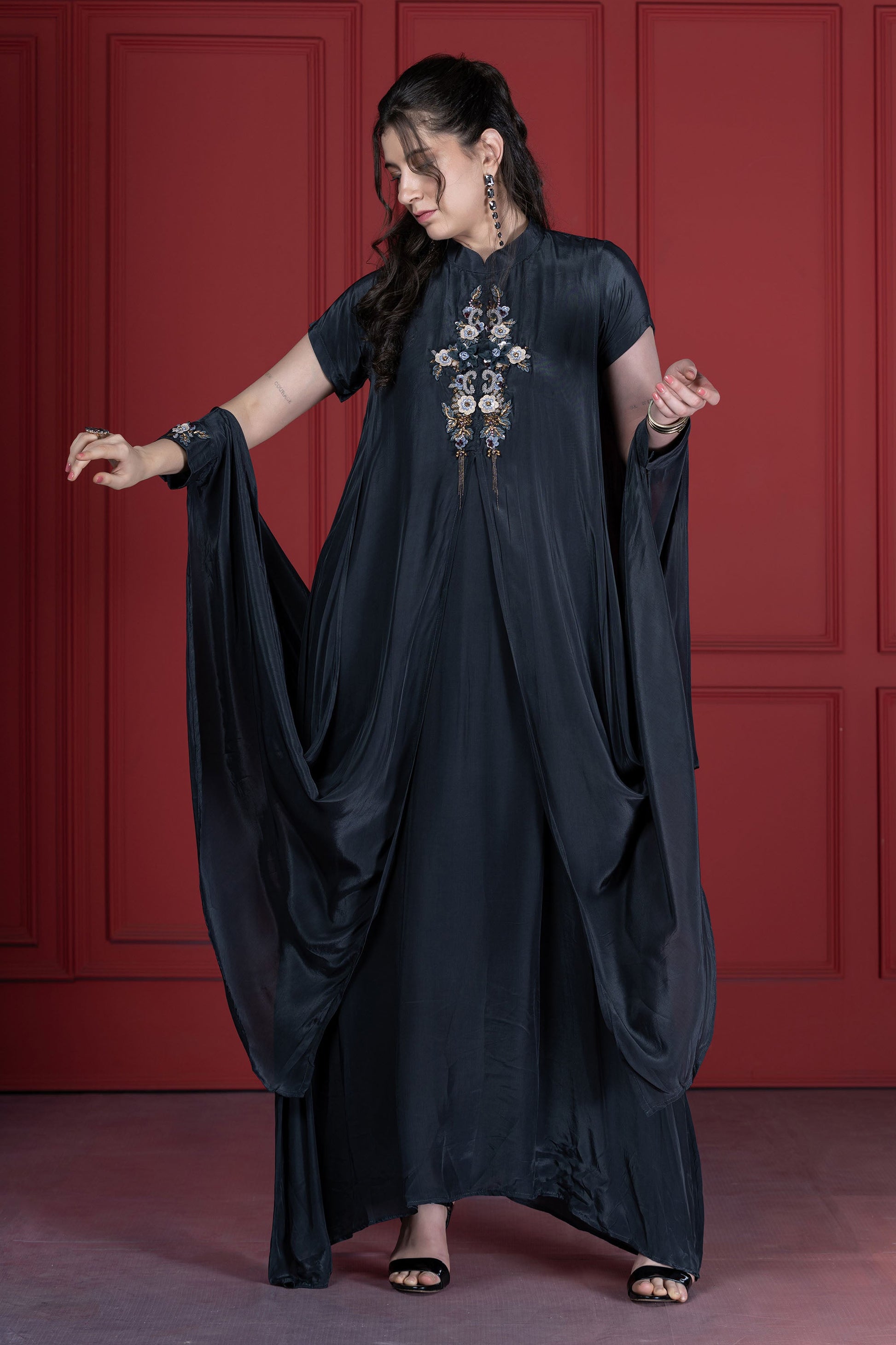 The most notable feature is the ultra-long sleeves or they may cinch at the wrists to resemble handcuffs,adding a unique element to the design.The length, combined with the oversided sleeves created enlongated look of the tunic.These 3d flower work changes the whole outfit look.