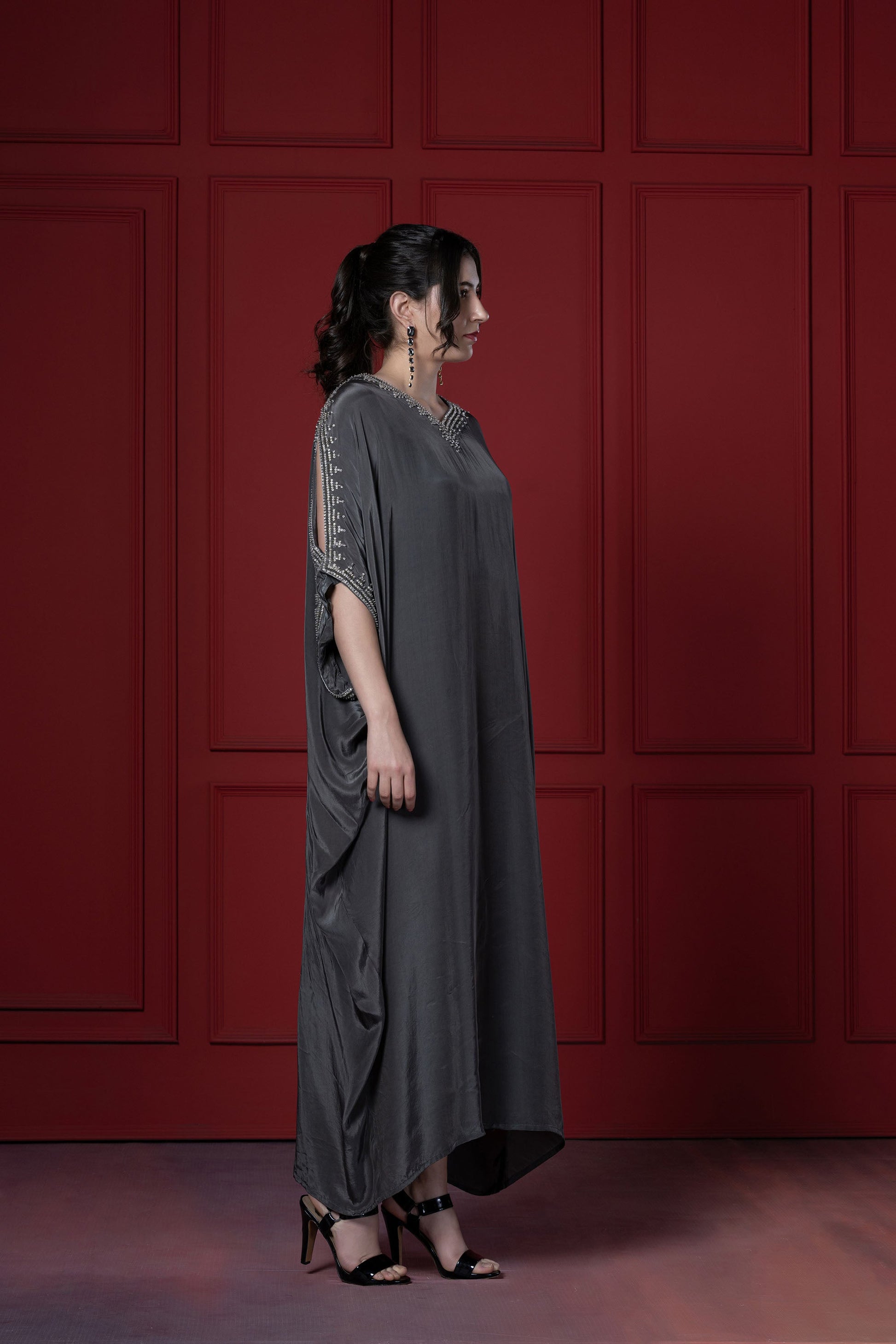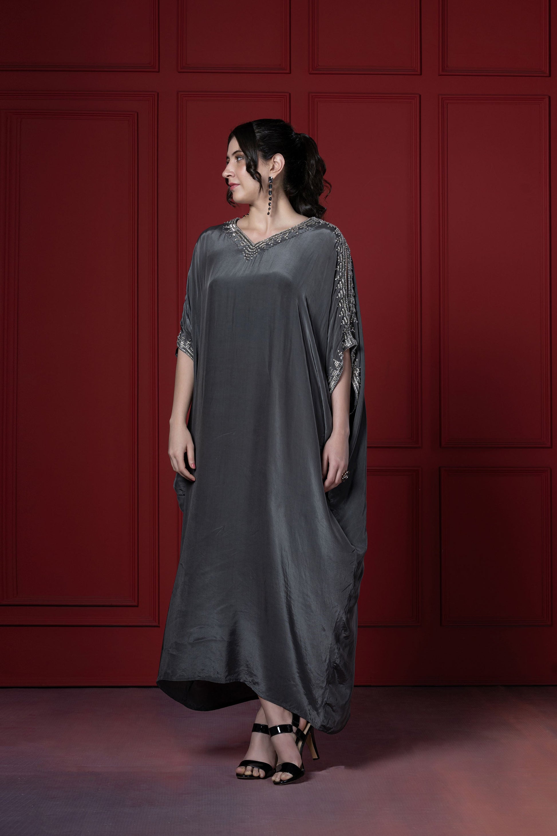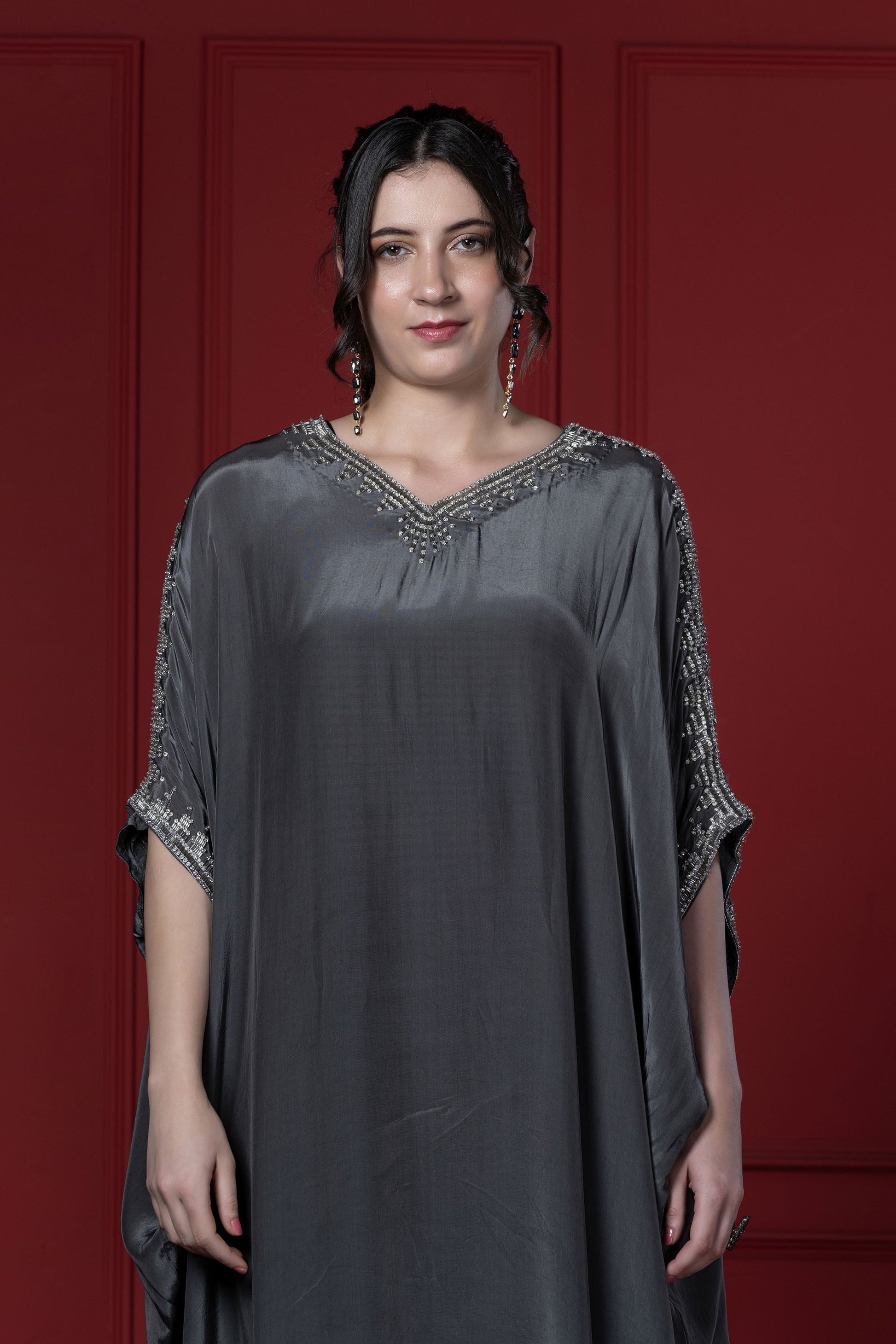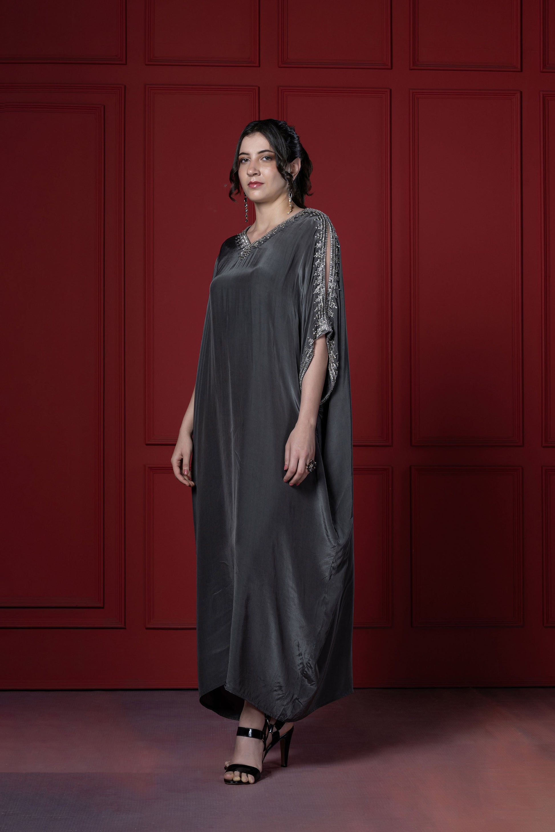 This is a stunning & luxurious garment that combines traditional kaftan design with elegant crystal embellishment on both sleeves,shoulder & neckline.
