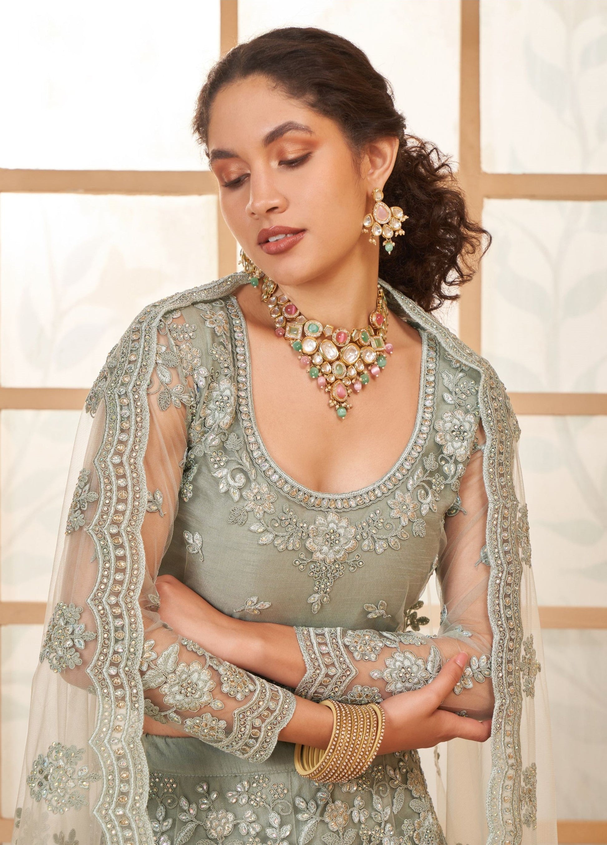 Grey Heavy Cording Embroidered Net Reception Lehenga Choli
