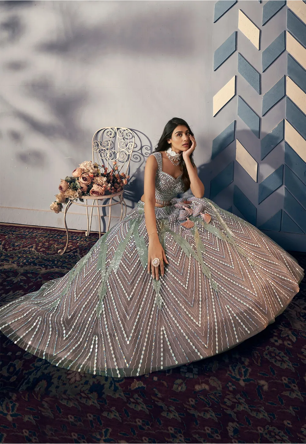 Grey Net Hand Work Stone And Beads Sangeet Lehenga