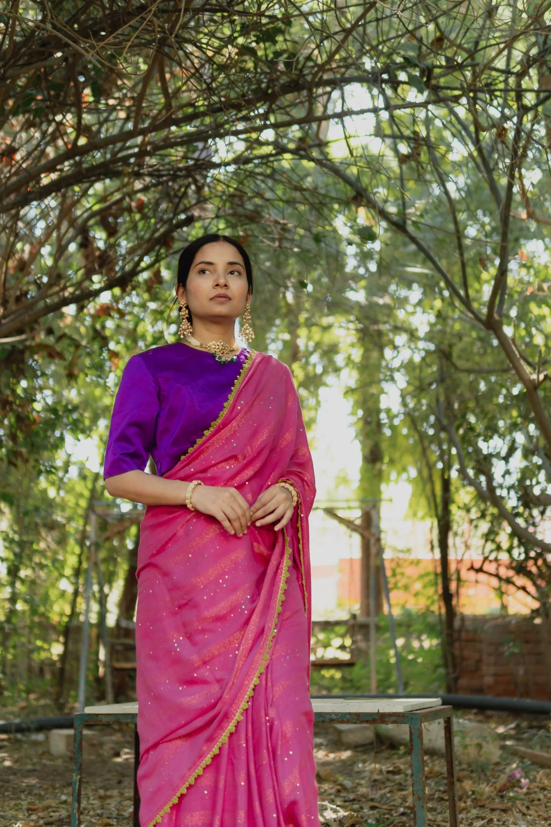 This saree is in cotton fabric with sequence and gold zari weave in it all over. Saree has golden gotta and green cotton lace border to enhance the look. Saree is light weight and easy to drape.