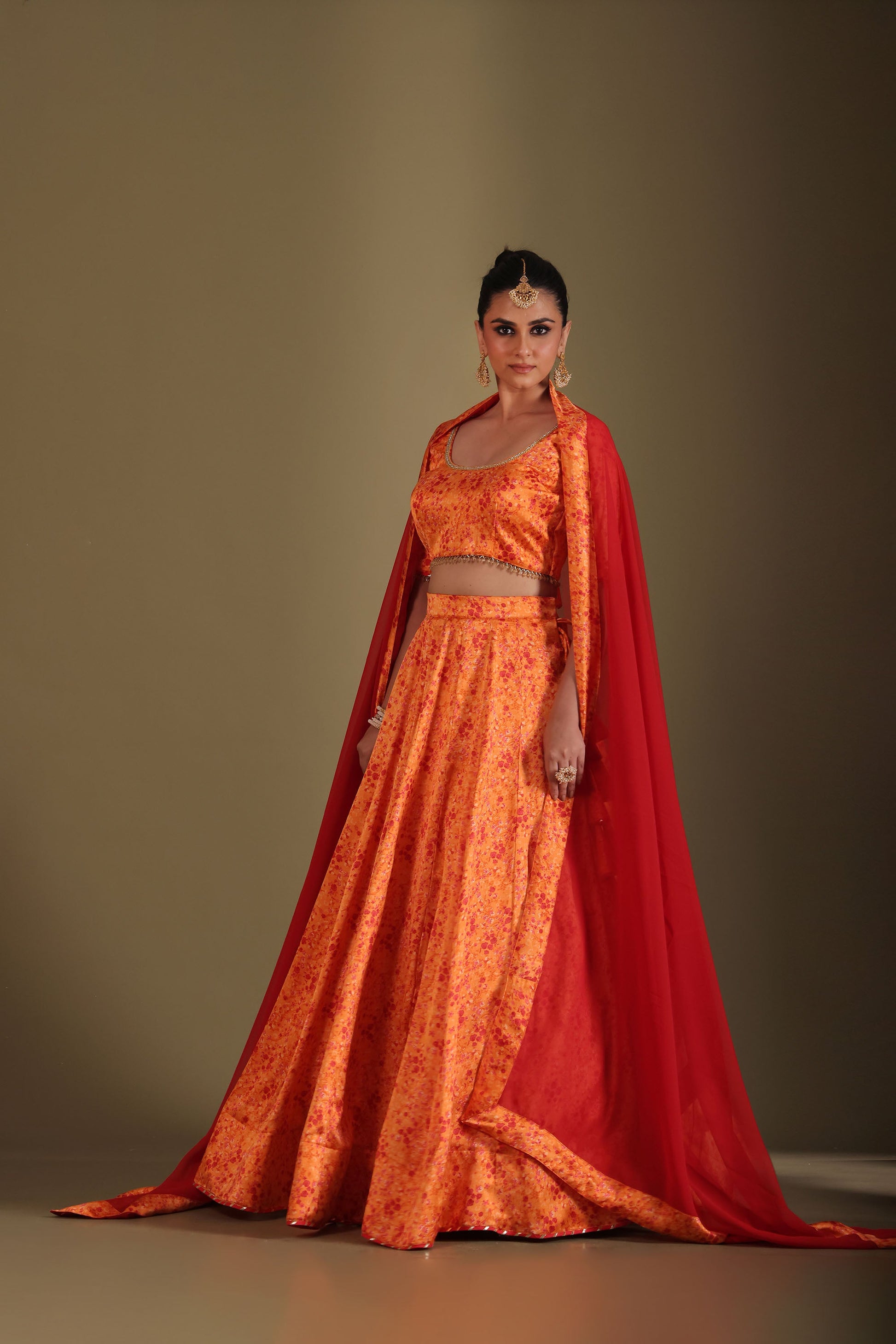 This set includes a Printed Satin Georgette Blouse, Kalidar Lehenga, and Red Georgette Dupatta.The blouse features a vibrant orange floral print in soft satin georgette, perfectly complementing the flowy kalidar lehenga with cancan for added volume. The look is completed with a red georgette dupatta, adorned with a coordinated printed border for a striking finish.