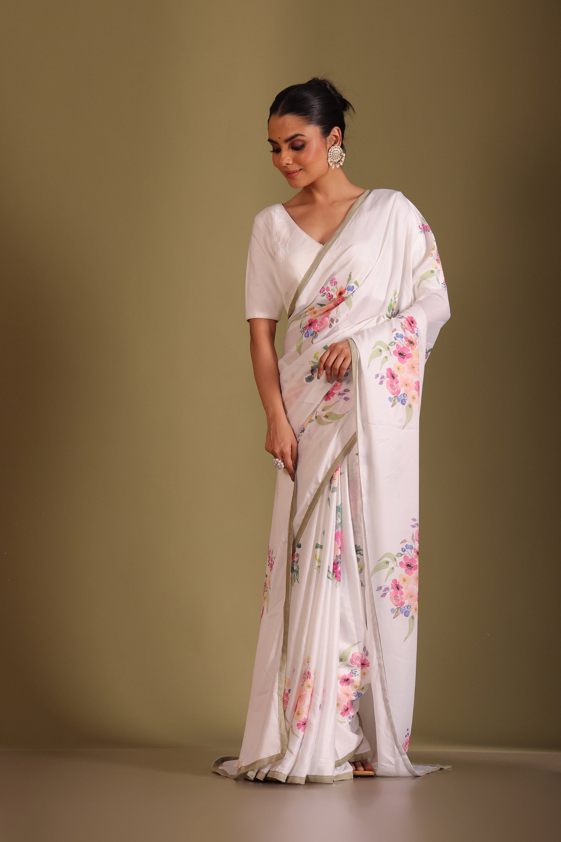 The saree is crafted in soft crepe, featuring delicate floral prints that lend an elegant, timeless charm.