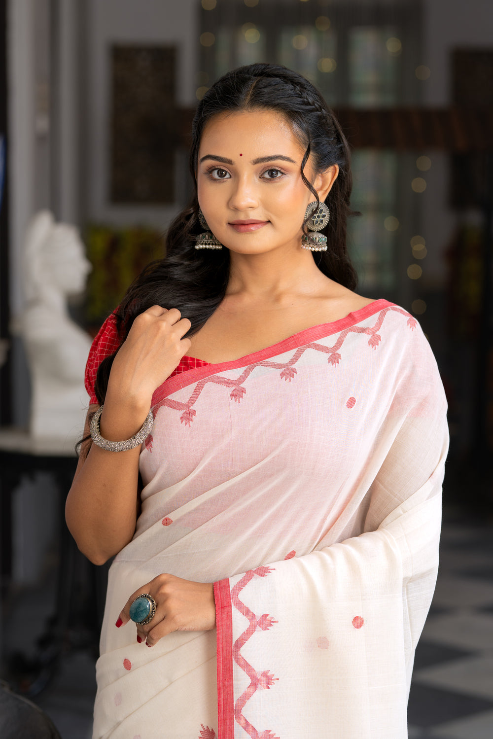 Handloom Off White Pure Cotton Laal Paar Jamdani Saree with Polka Motifs