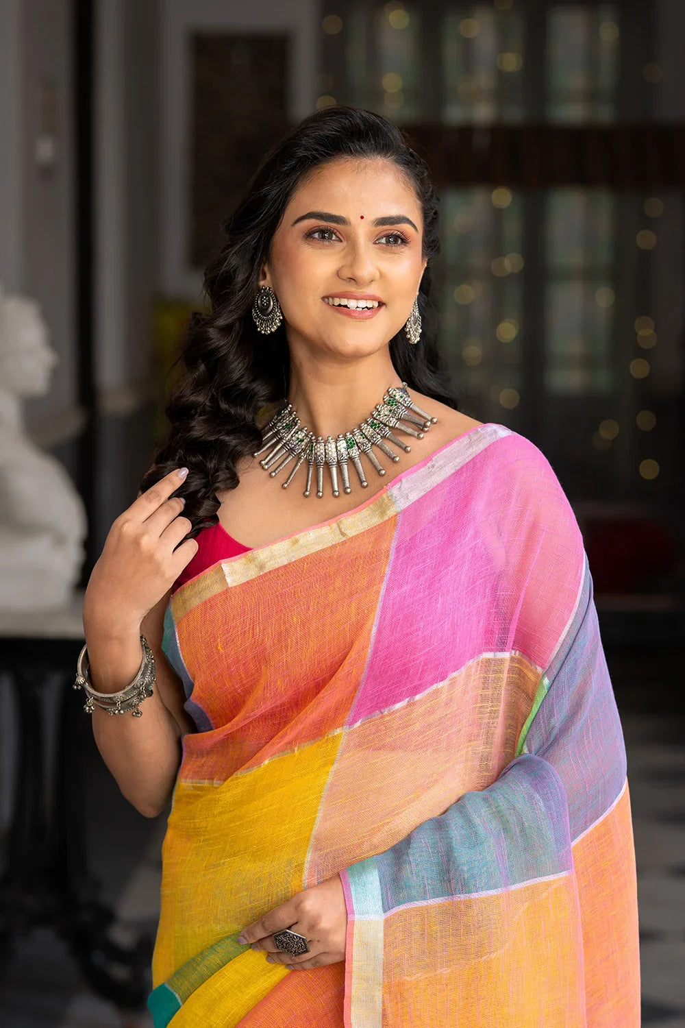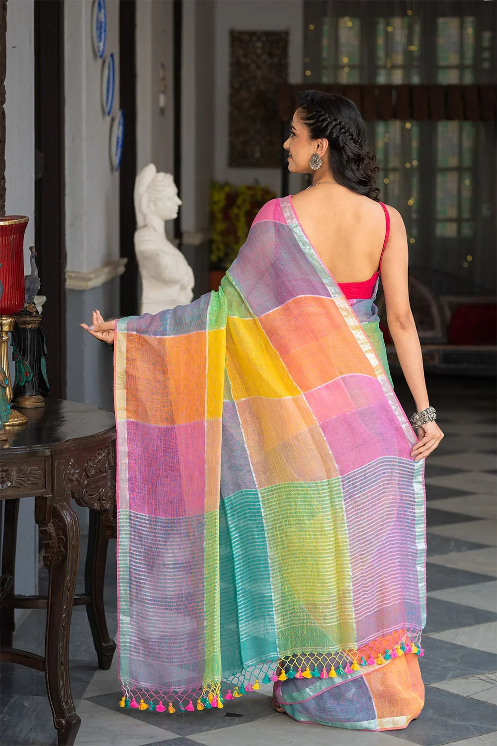 Handloom Pastel Multi Colour Linen Saree