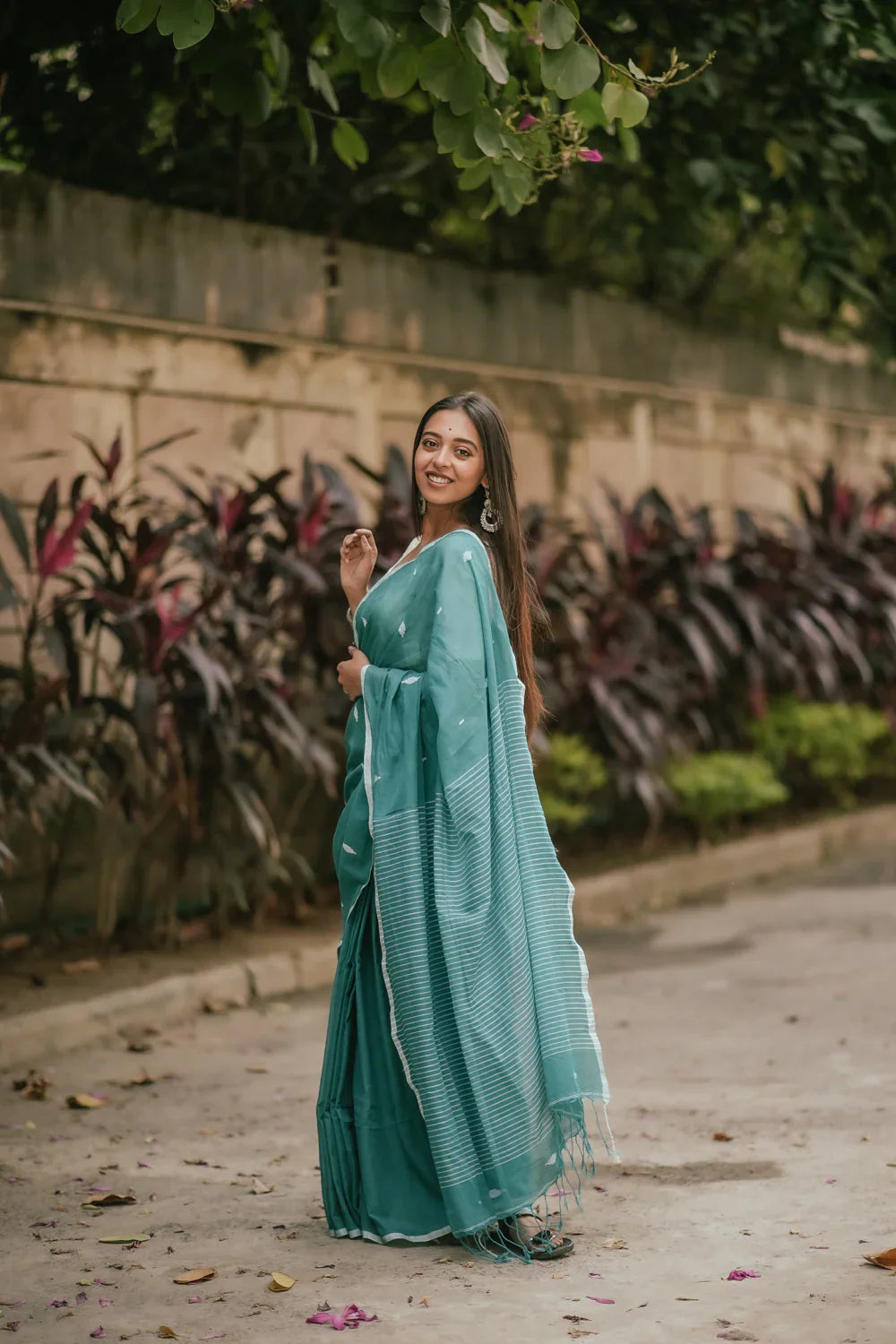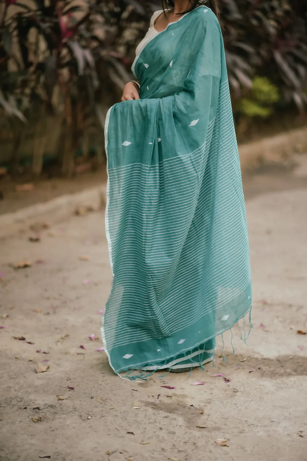Handloom Aqua Green Mulmul Jamdani Saree exudes delicate charm with its soft, breathable mulmul fabric. Featuring intricate Jamdani weaving in subtle patterns, this saree showcases an enchanting aqua green hue, perfect for both casual and festive occasions. Its lightweight texture ensures comfort, while the timeless craftsmanship makes it a graceful addition to any wardrobe.