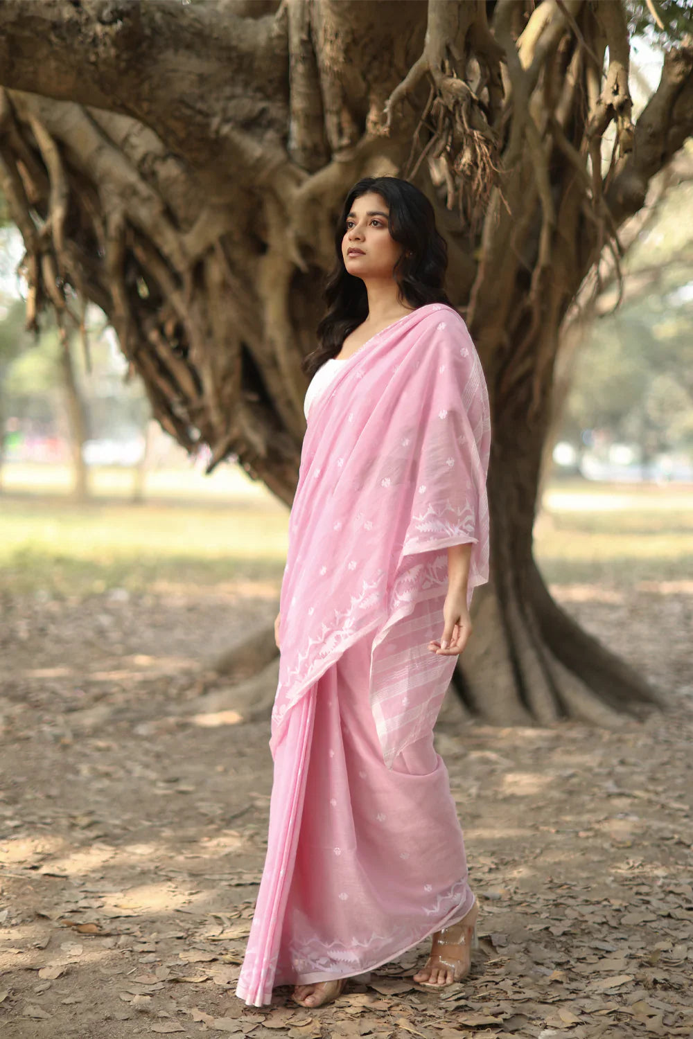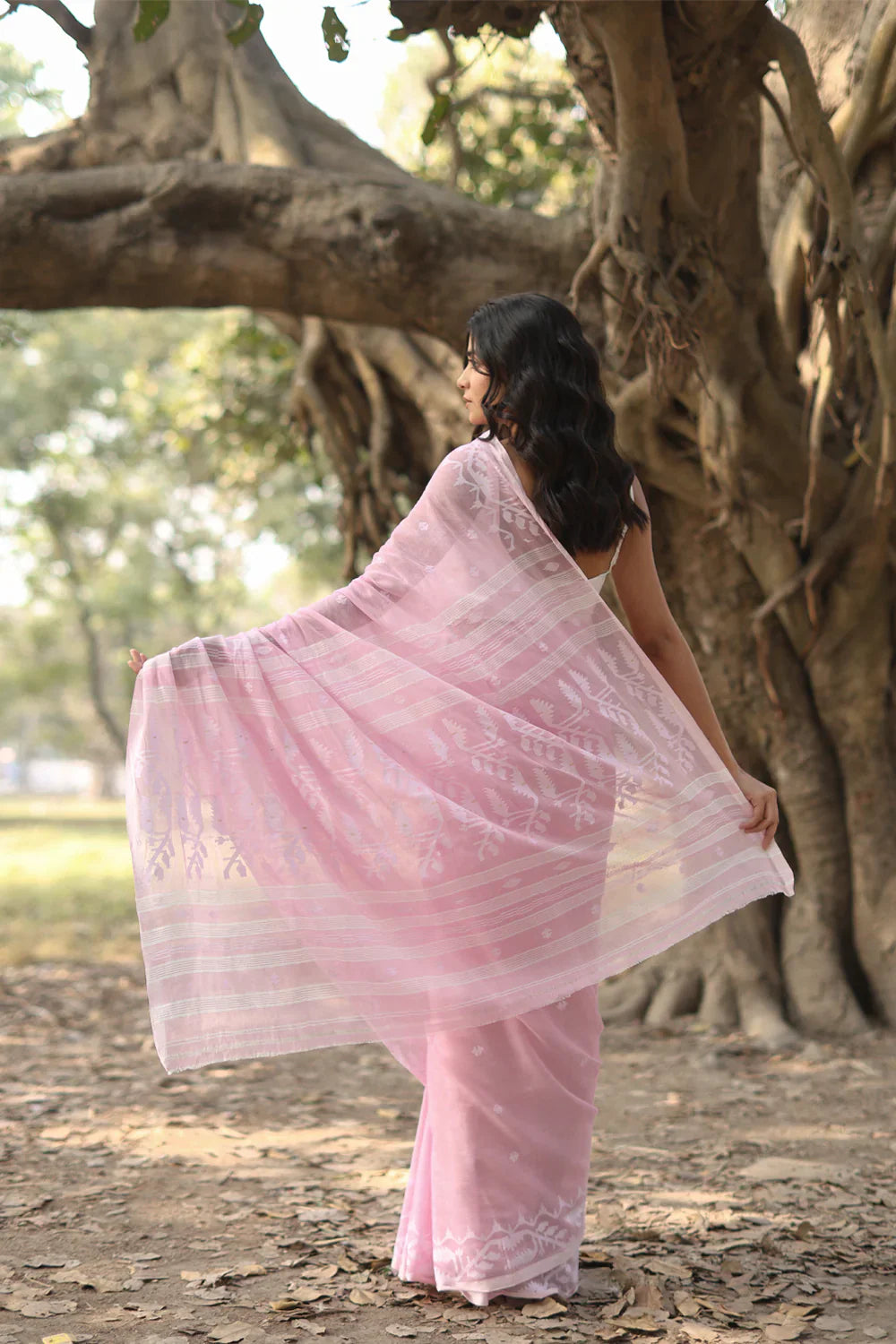 Handloom Baby Pink Pure Cotton Jamdani Saree with White Woven Border