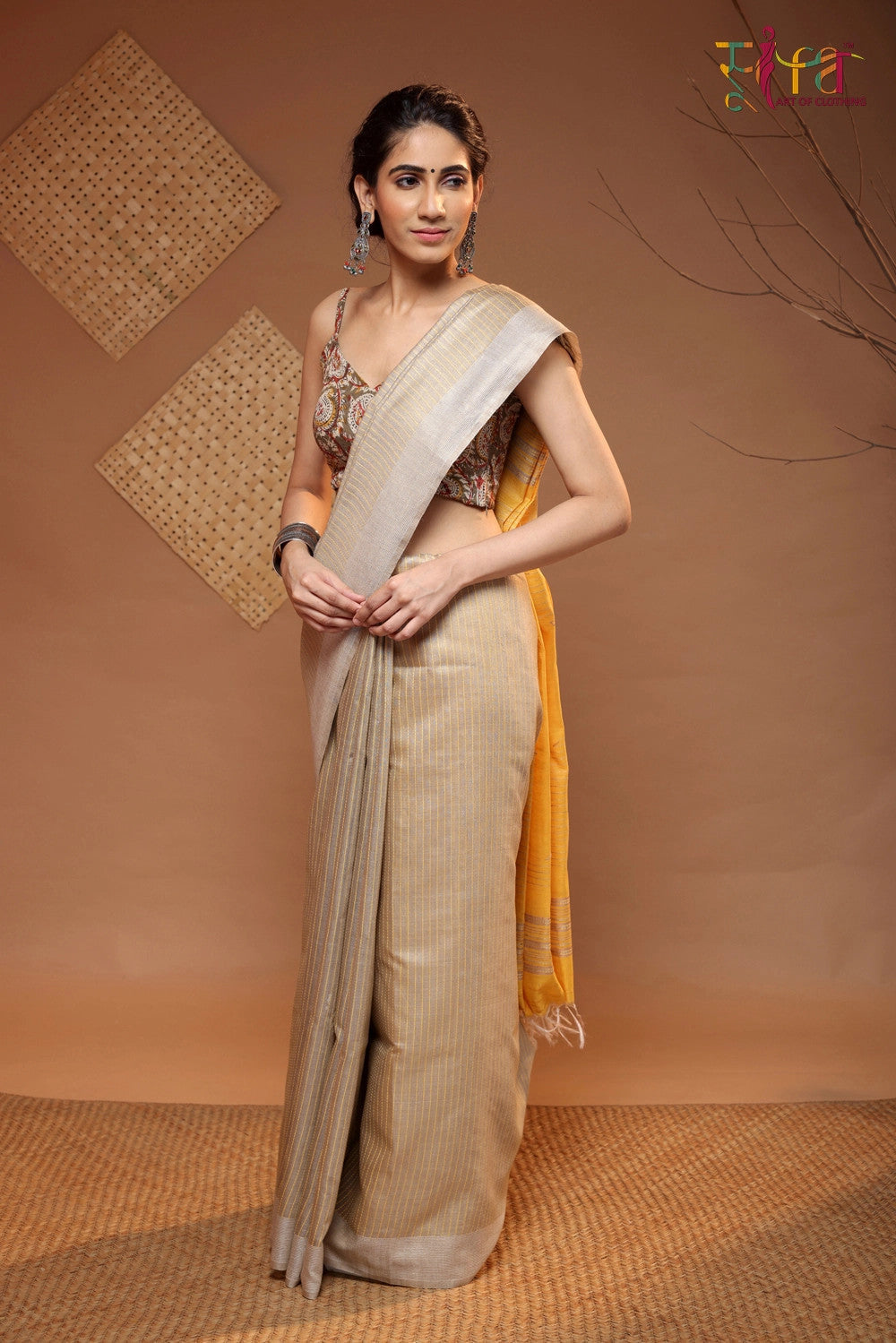 BDiscover timeless elegance with our Handloom Beige Tussar Muga Silk Saree. Adorned with intricate yellow stripes, its versatile charm seamlessly suits office or ethnic occasions. The striking yellow pallu and attached blouse piece complete the ensemble, reflecting craftsmanship and sophistication. Experience the fusion of tradition and modernity as you embody grace and style. Elevate your wardrobe with this masterpiece that encapsulates the essence of handloom artistry and personal expression.