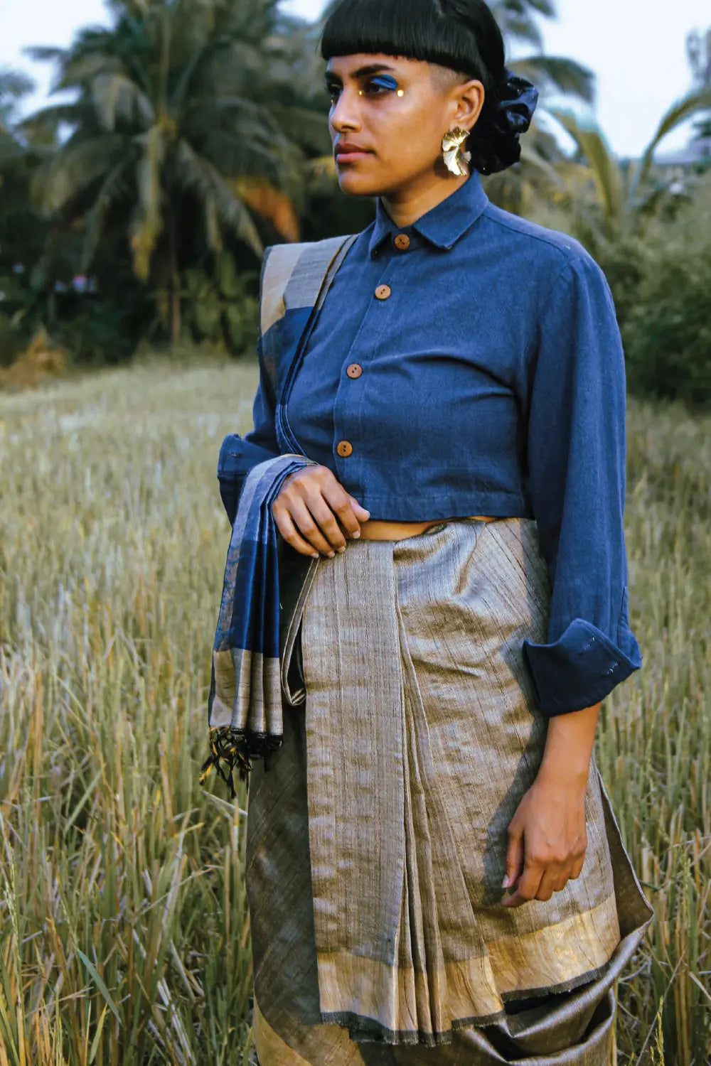 Elevate your style with our Handloom Beige Tussar Silk Saree, a blend of tradition and contemporary allure. The Zari border and Navy Blue Pallu exude timeless sophistication. Drape it uniquely, mirroring the picture, for a modern, avant-garde look that reinvents saree elegance. The luxurious beige Tussar silk adds a touch of refinement, offering a distinctive fashion statement like never before. Embrace a fusion of heritage and modernity, transforming your ensemble into a captivating masterpiece. Redefine your style with this unique piece that seamlessly merges tradition with a modern aesthetic.