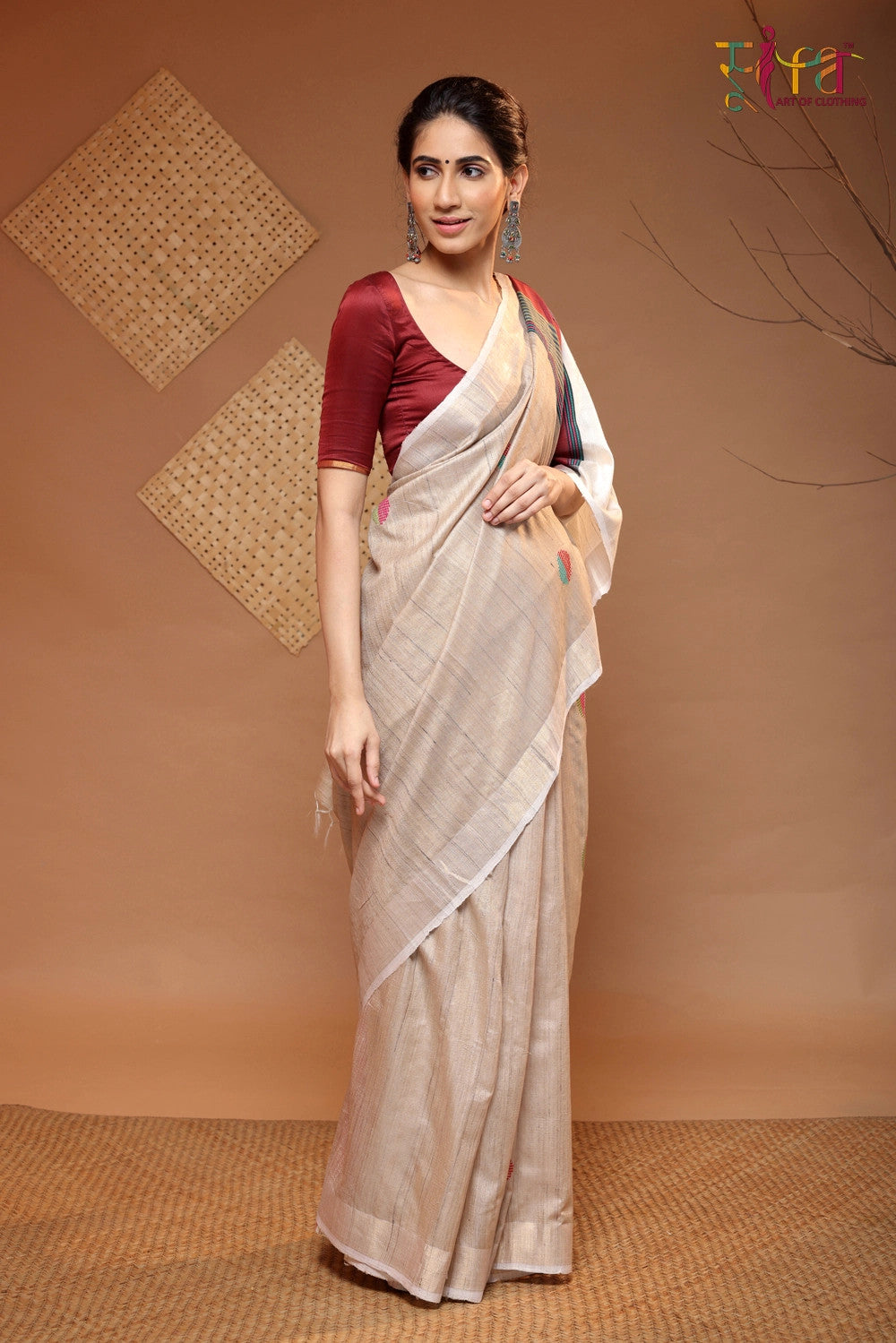 Discover elegance in our Handloom Beige tussar Silk Saree, where red and green motifs intertwine gracefully, narrating tales of tradition. The golden Zari border adds regal opulence, while the pallu features a mesmerizing blend of red, green, and black stripes. Meticulously handcrafted, this saree epitomizes artistry and heritage, draping you in timeless charm. Express your unique style confidently at any occasion, as the fusion of colors bridges the gap between classic and contemporary. Adorn yourself with a masterpiece that weaves together threads of culture, sophistication, and individuality – the Handloom Beige Kosa Silk Saree.