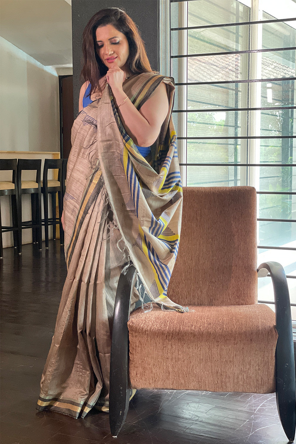 Handloom Bhaglpur Beige Pure Silk Saree With Woven Navy Blue Motifs