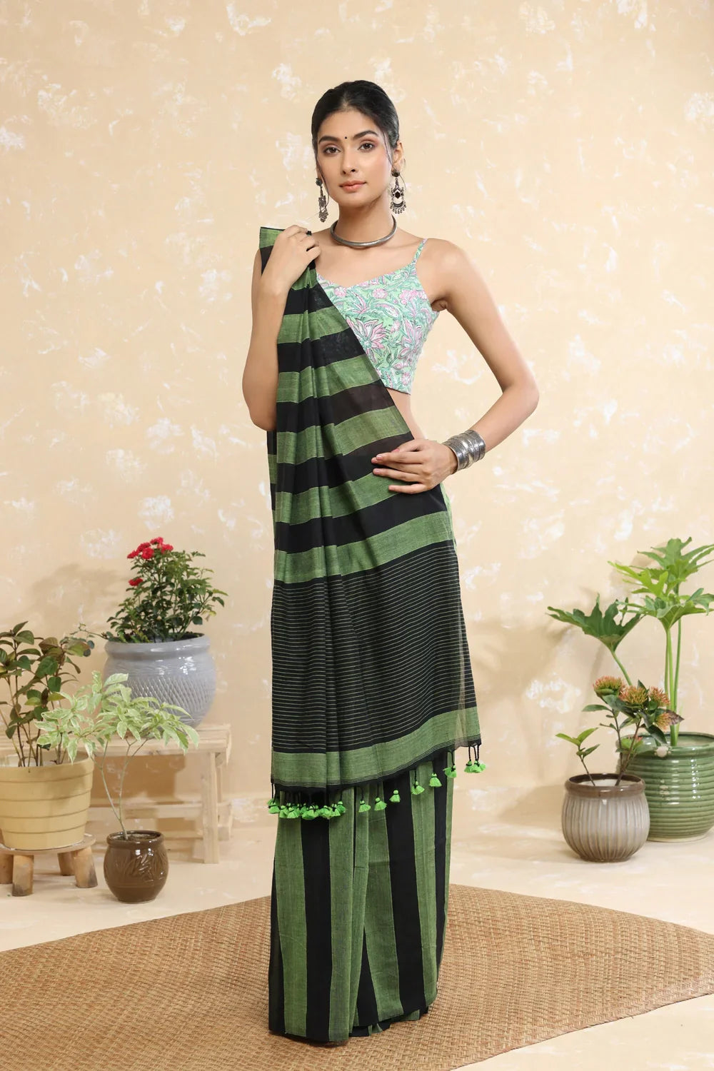 Elevate your style with our Handloom Black & Green Stripes Mulmul Saree. Crafted from soft and breathable mulmul fabric, this saree offers exceptional comfort. The striking black and green stripes create a bold and contemporary look, perfect for any occasion. Handwoven with care, this saree combines traditional craftsmanship with modern design, making it a versatile and chic addition to your wardrobe
