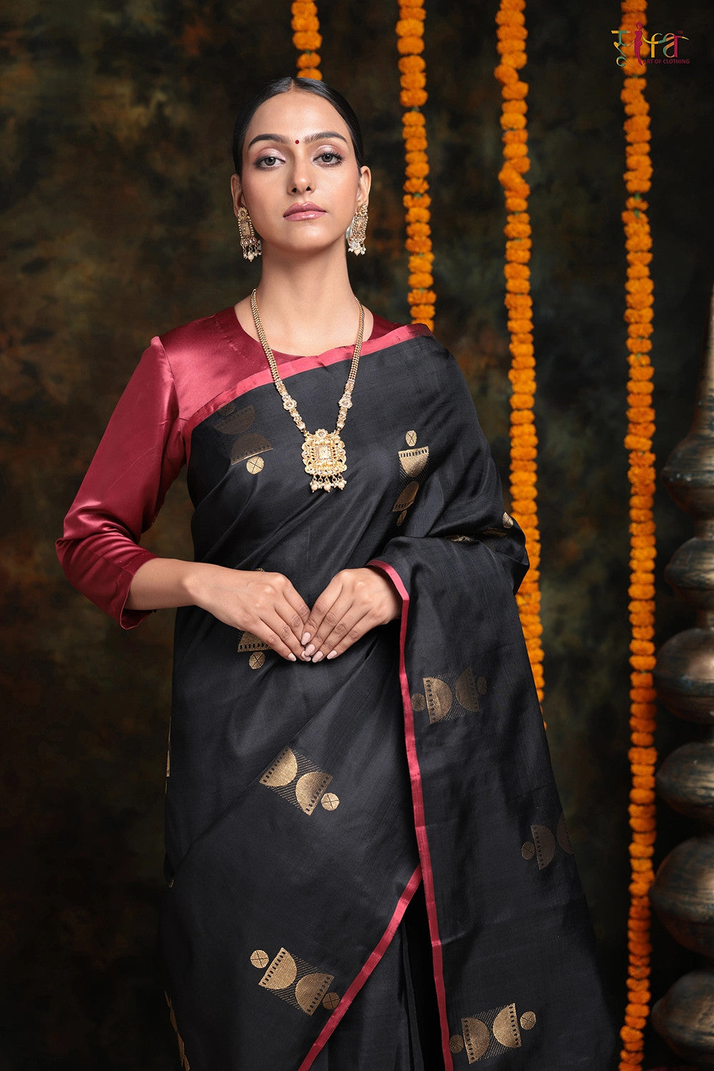 Behold the mesmerizing allure of our Black handwoven saree, a true embodiment of pure elegance! Experience the grace of Adjoining Golden Zari Motifs gracefully adorning the body, while meticulously crafted Golden Zari Motifs on the pallu, accompanied by charming tassels, add an irresistible allure. This saree is a must-have for your collection, showcasing exceptional weaving craftsmanship and unmatched quality. Prepare to make a captivating statement as you drape yourself in this exquisite masterpiece, leaving everyone in awe of your timeless style and undeniable sophistication.