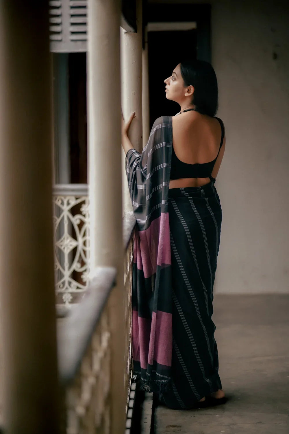 Handloom Black Mulmul Saree with Stripes & Wine Pallu