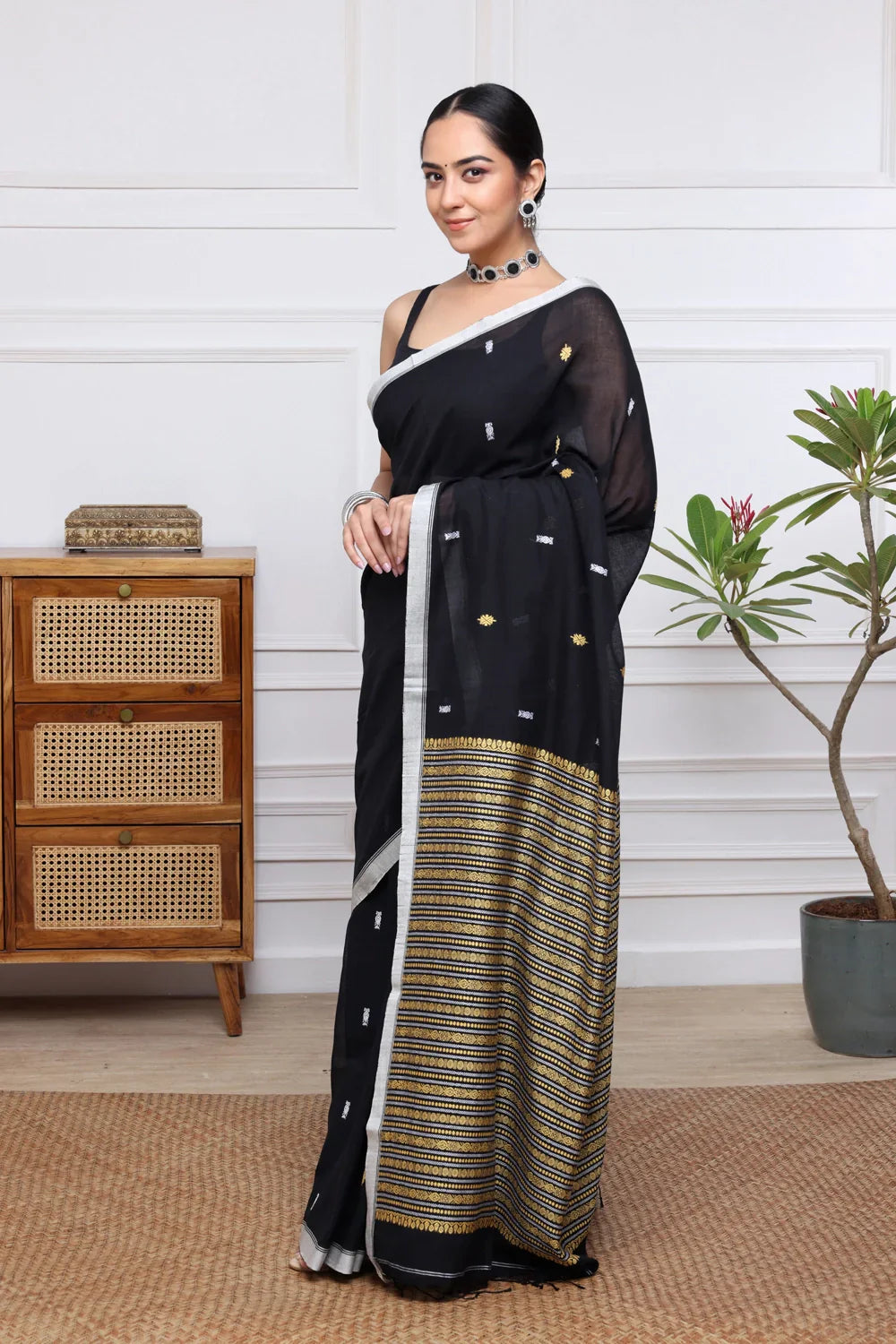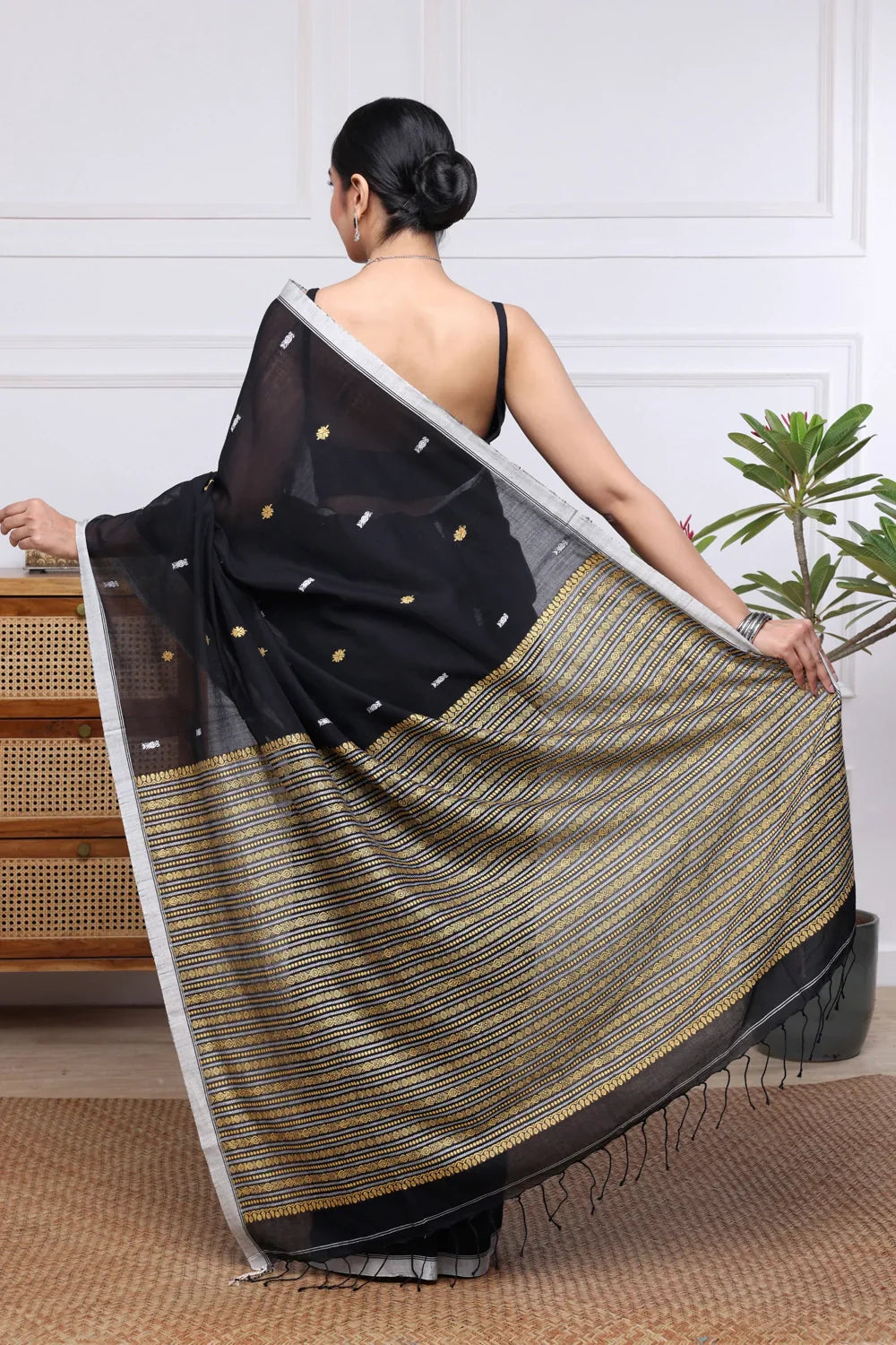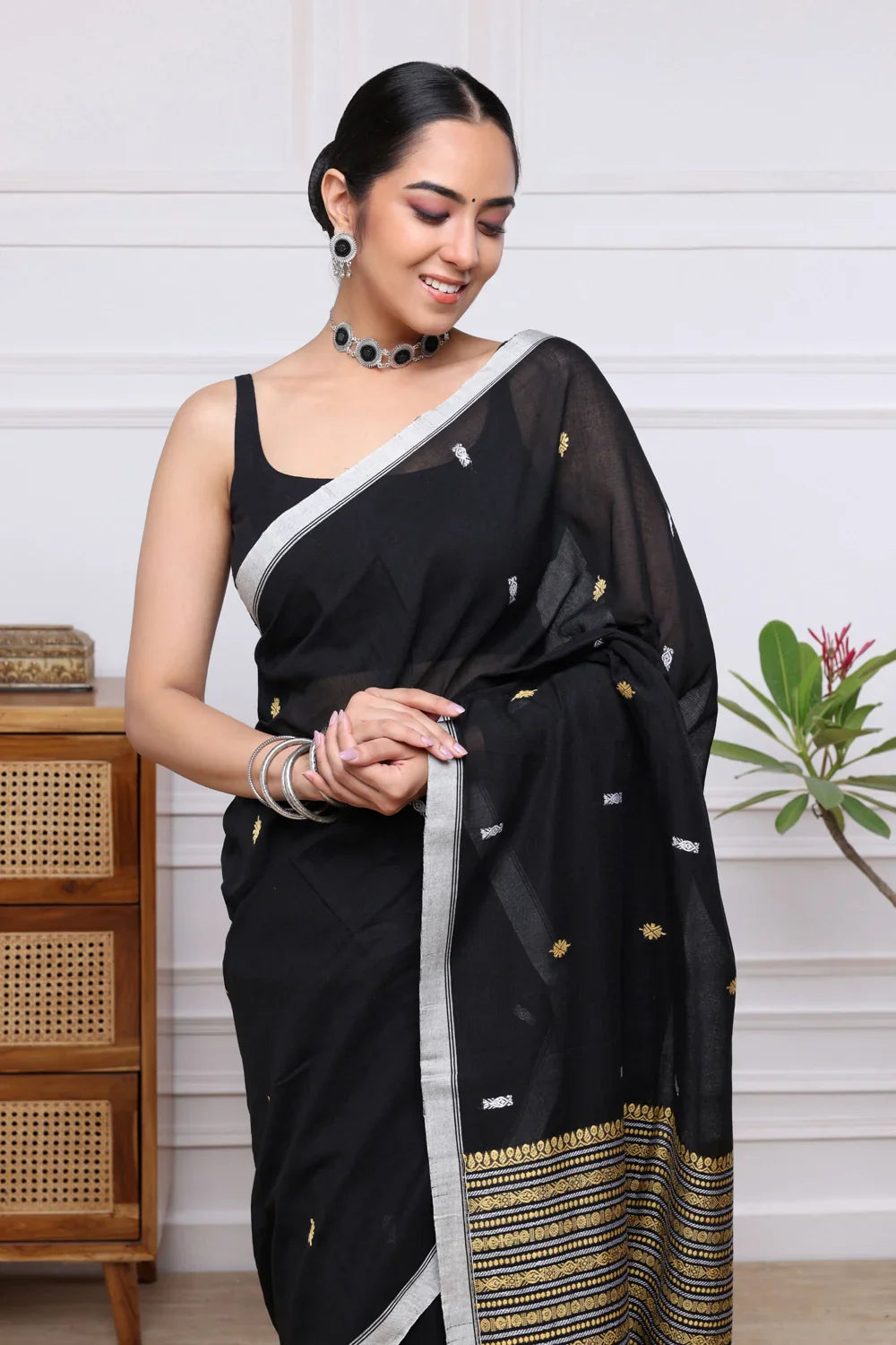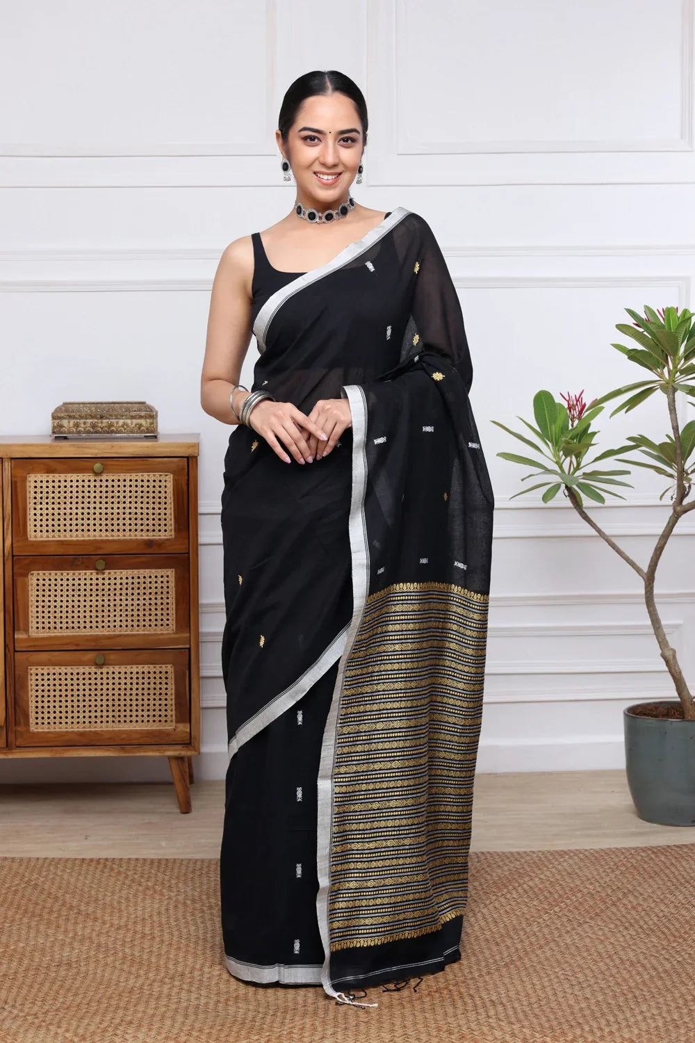 Exude sophistication with this Handloom Black Pure Cotton Saree, a perfect blend of tradition and elegance. Handcrafted by skilled artisans, this saree features a deep black hue that radiates timeless charm. The pure cotton fabric ensures maximum comfort and breathability, ideal for any occasion. Its classic design and impeccable craftsmanship make it a versatile addition to your wardrobe, perfect for both everyday wear and special events. Elevate your style with this exquisite handloom saree.