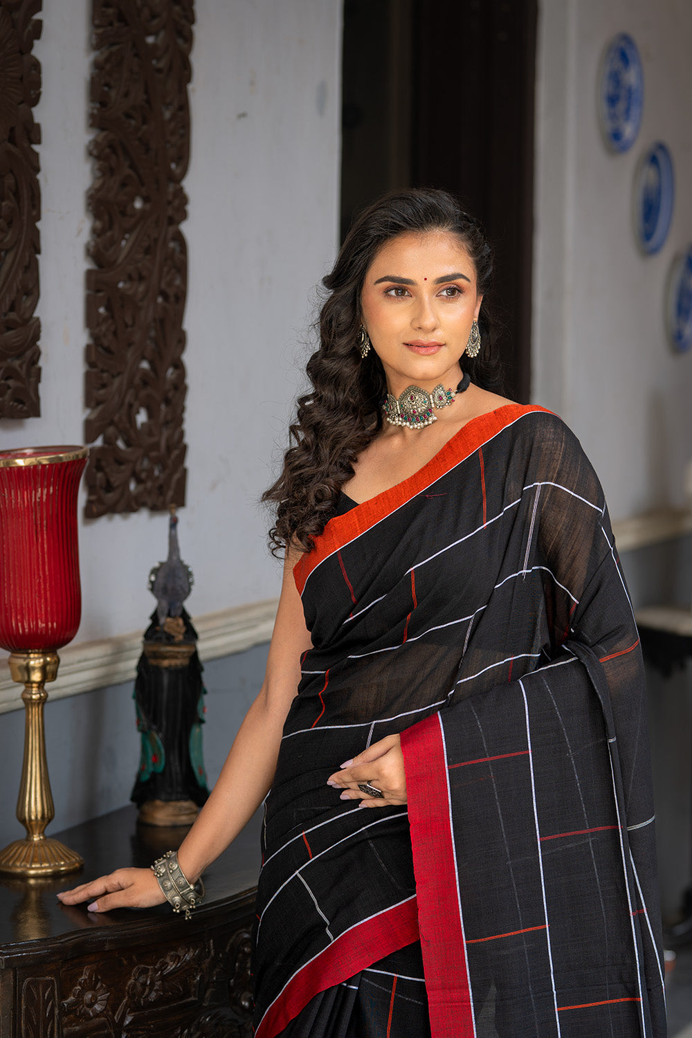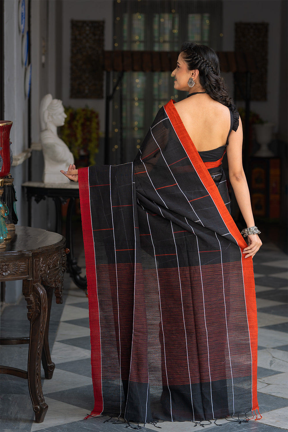 Handloom Black Soft Cotton Brick Check Saree
