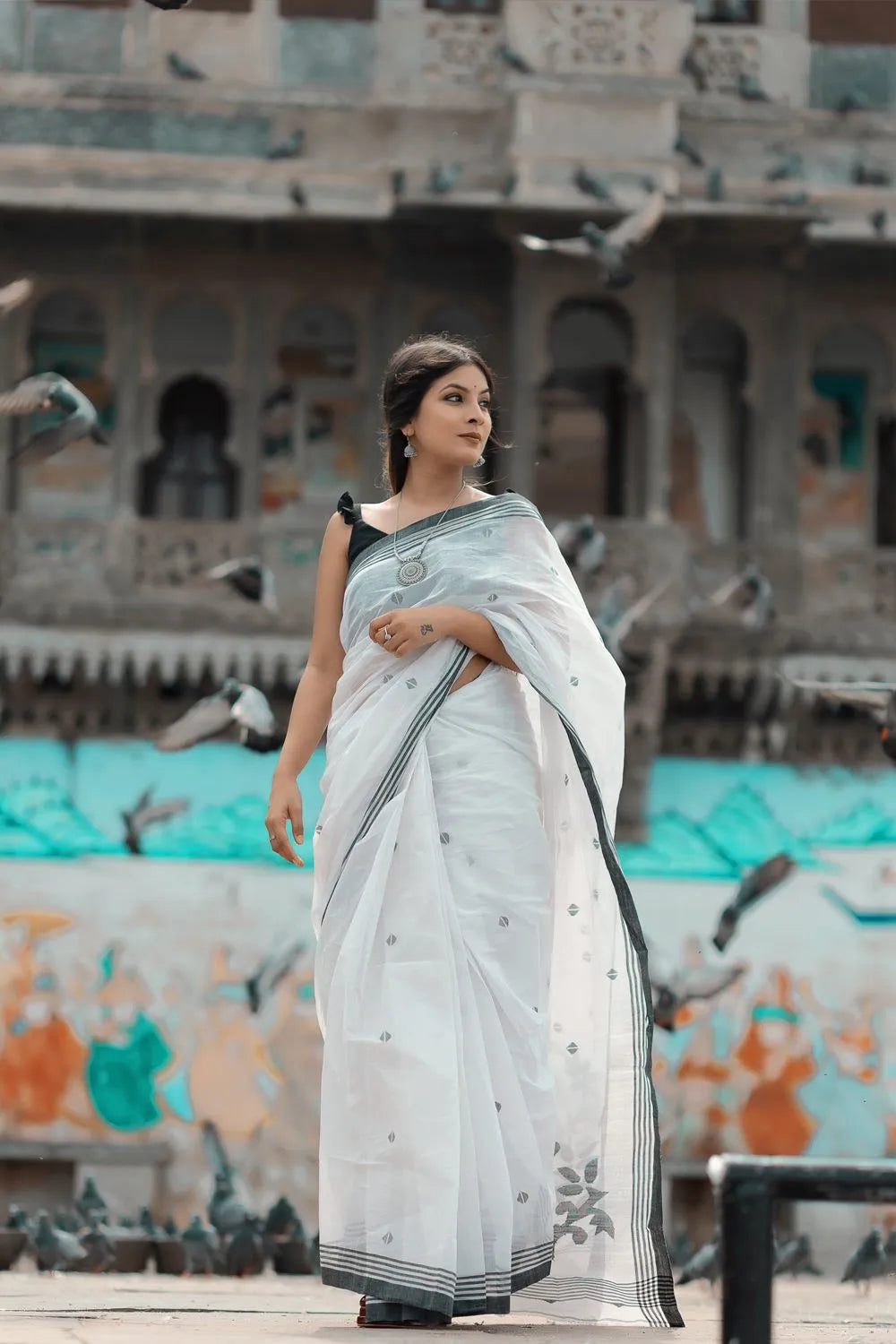 Elevate your style with our Handloom Black & White Pure Cotton Jamdani Saree adorned with exquisite floral motifs. Crafted by master weavers, this saree showcases the timeless Jamdani weaving technique, known for its detailed and delicate patterns. The pure cotton fabric ensures maximum comfort and ease of wear, while the classic black and white combination offers a sophisticated look. Perfect for both formal and casual occasions, this saree is a tribute to elegant simplicity and traditional craftsmanship.