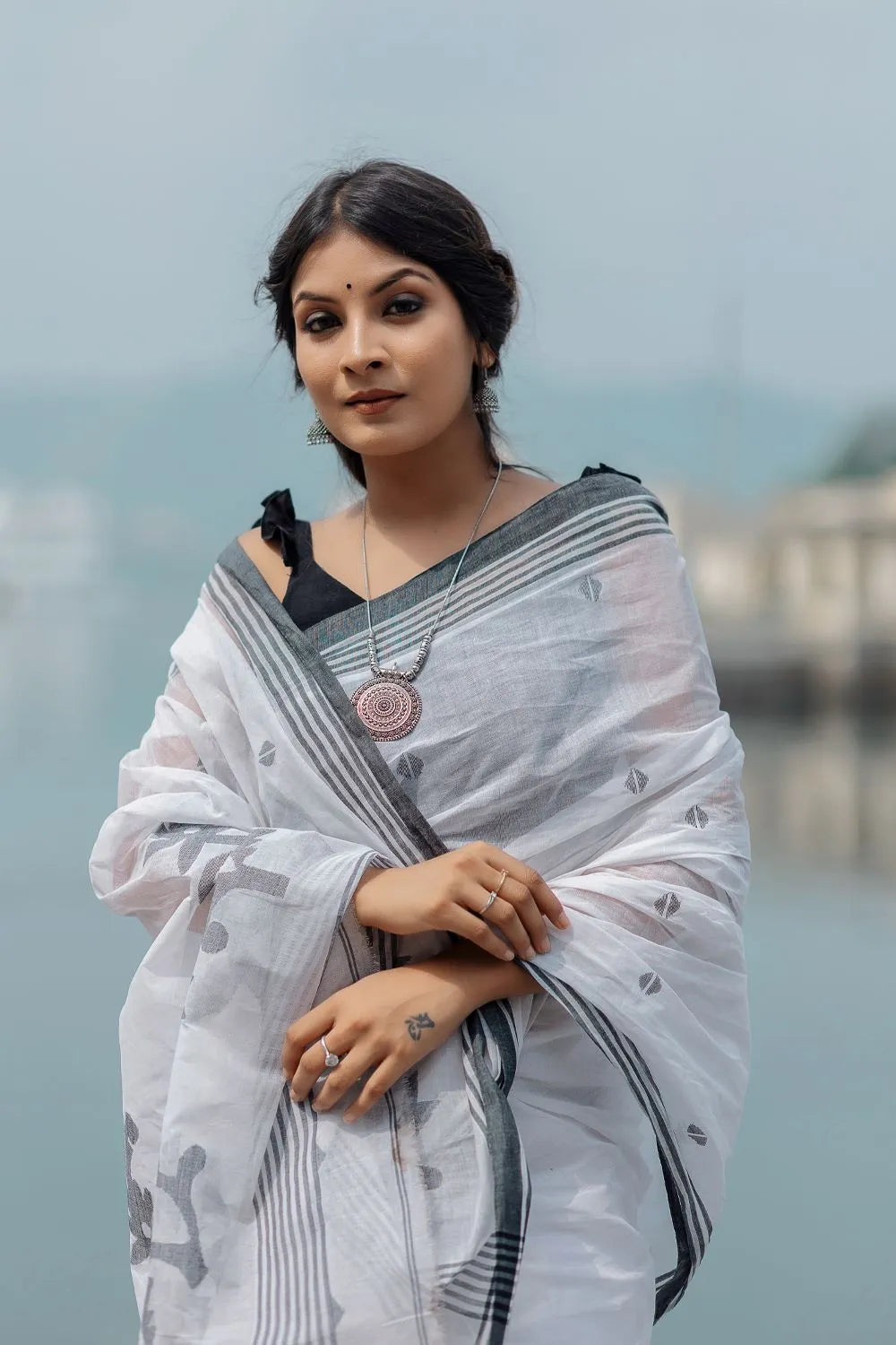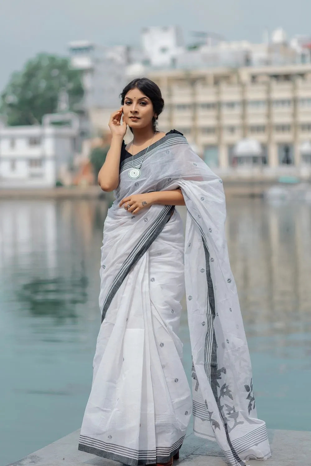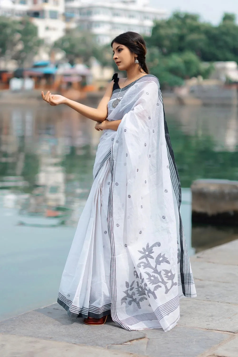 Handloom Black & White Pure Cotton Jamdani Saree with Floral Motifs
