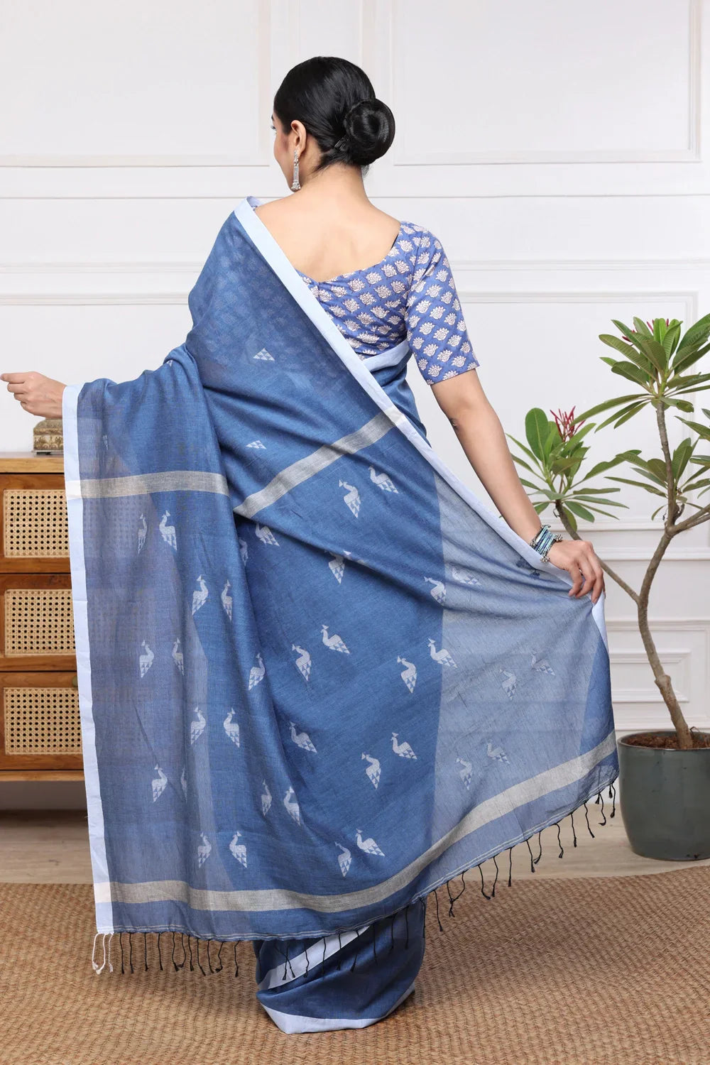 Handloom Blue Mulmul Cotton Mayur Jamdani Saree