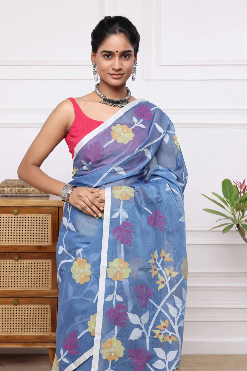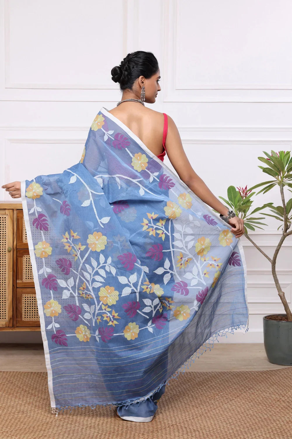 Handloom Blue Pure Cotton Multi Colour Floral Jamdani Saree