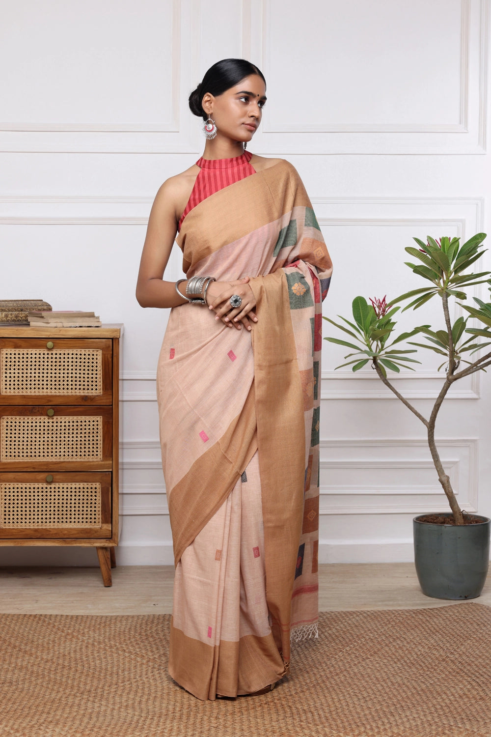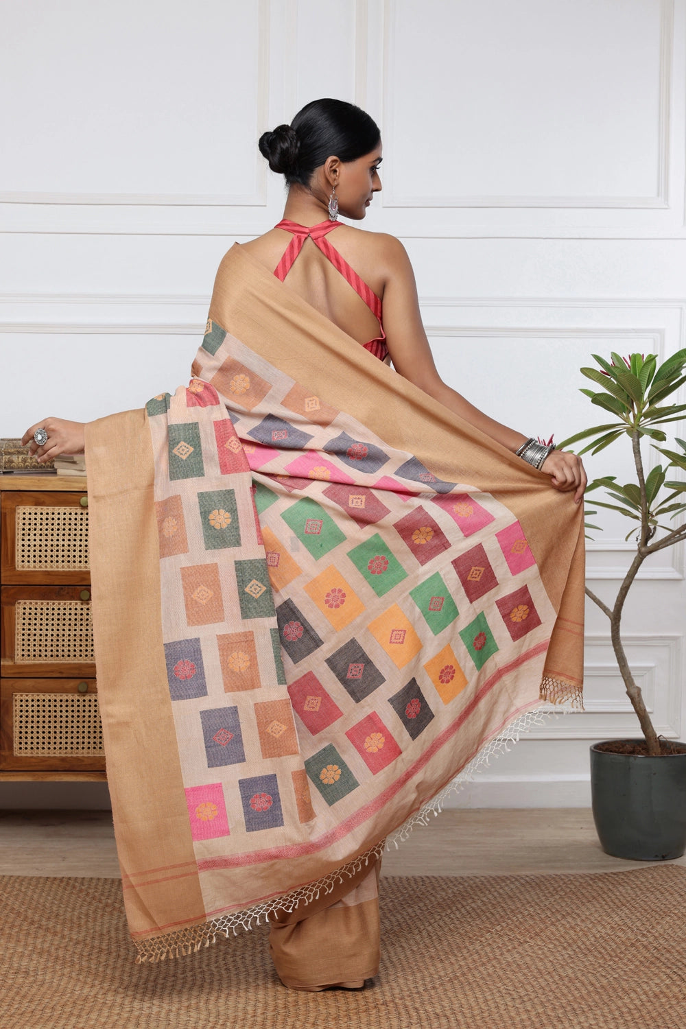 Enhance your wardrobe with our Handloom Brown Soft Cotton Jamdani Saree, adorned with vibrant multi-colour box motifs. Crafted from premium soft cotton, this saree offers unmatched comfort and style. The intricate Jamdani weaving technique highlights the colorful box patterns, merging traditional artistry with contemporary design. Perfect for both casual and festive occasions, this saree exemplifies exquisite craftsmanship and timeless elegance. Ideal for those who appreciate unique, handcrafted fashion statements.