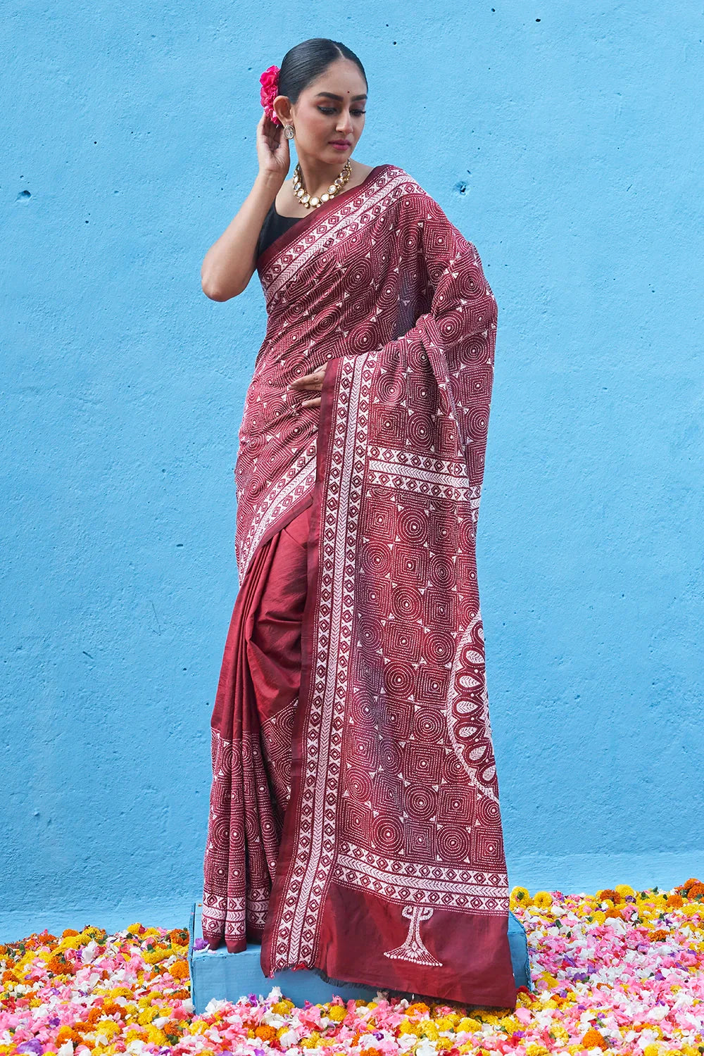 Handloom Burgundy Red Pure Silk Kantha Saree
