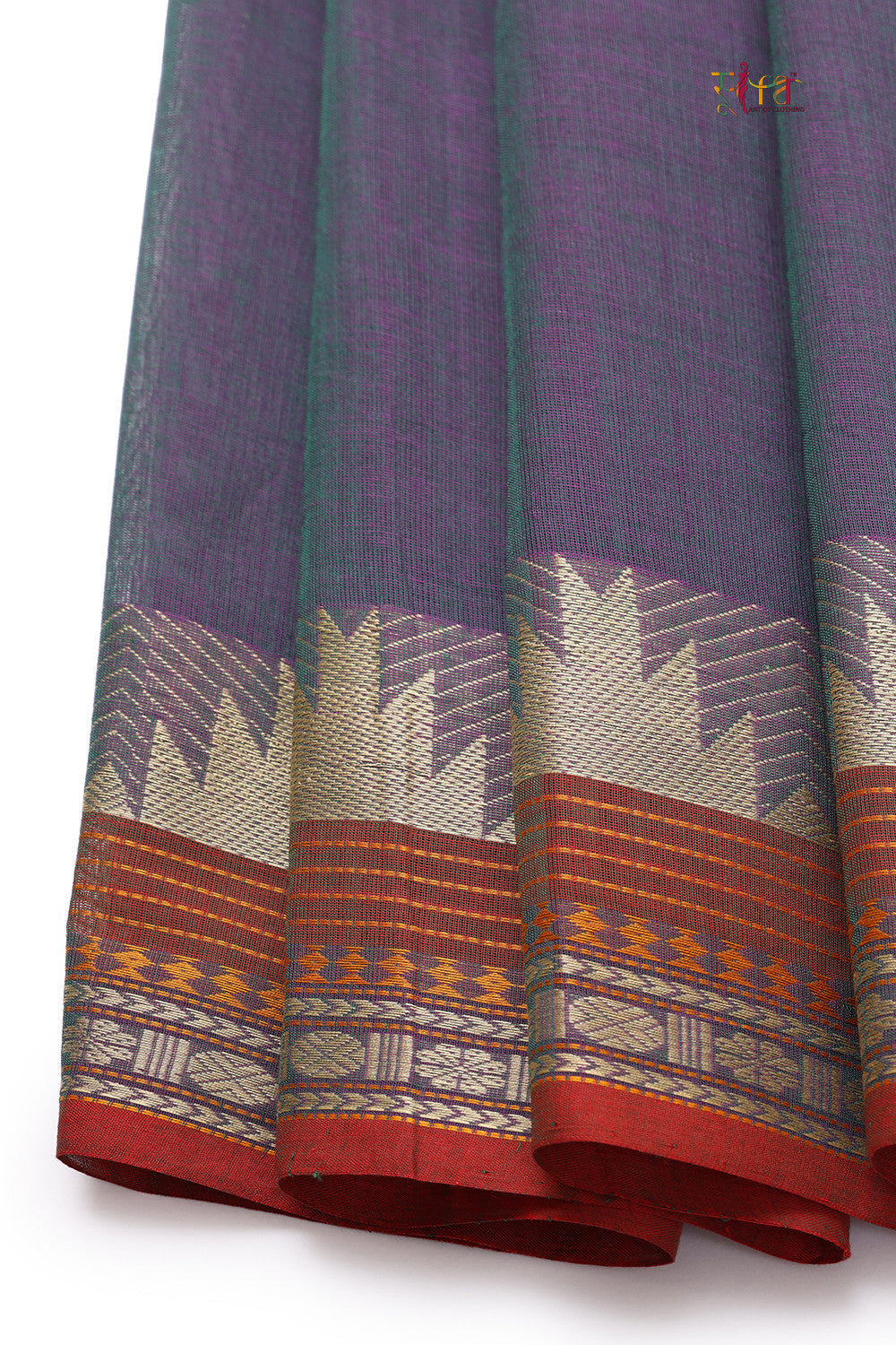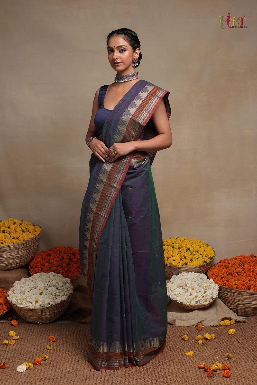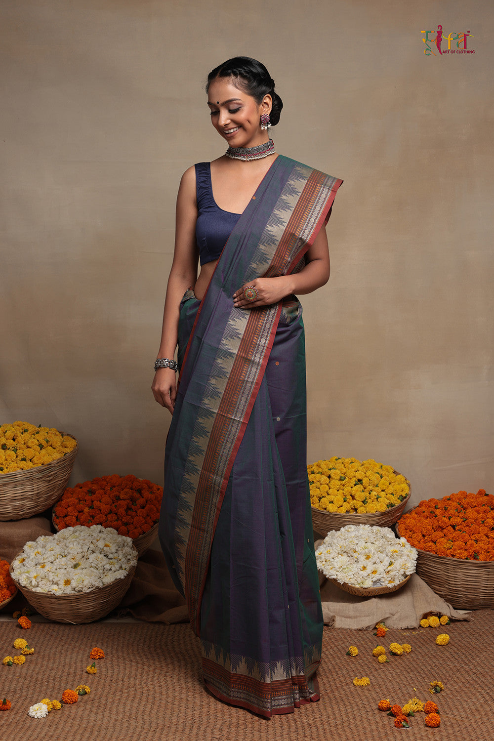 Embrace the timeless elegance of our handloom Pure Cotton saree in celestial Blue, a truly iconic masterpiece that leaves an unforgettable impression. The captivating Orange border, showcases temple motifs reminiscent of majestic pyramids. Adorn yourself with this luxurious saree for your special occasions and be prepared to receive an abundance of compliments like never before. This exquisite piece is a true masterpiece that guarantees you will stand out in every celebration on your calendar. The unique combination of Orange and Beige colors in border adds to its grace and individuality.