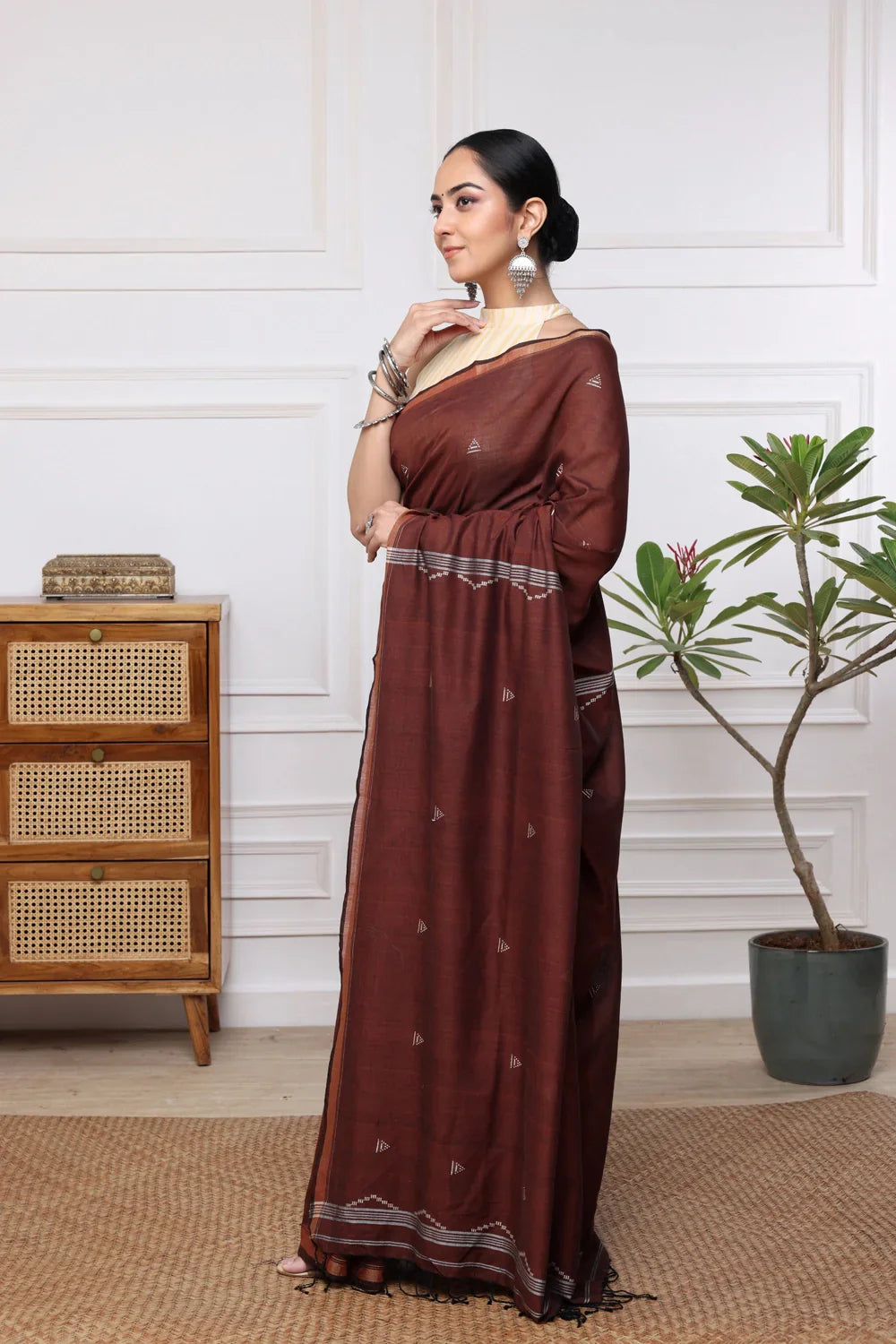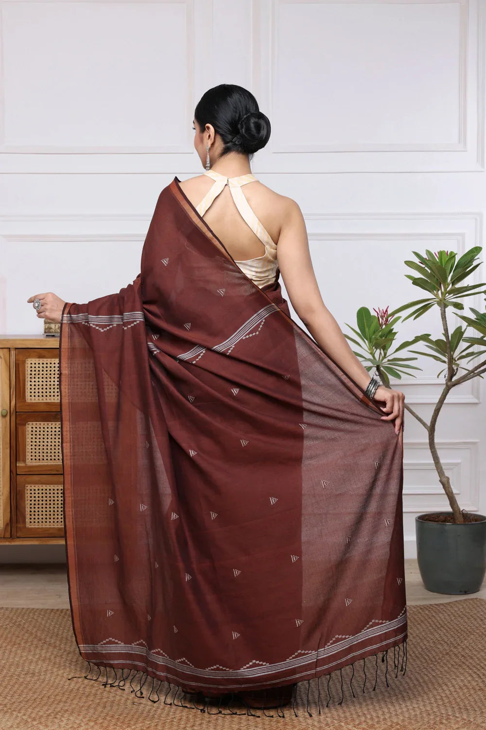 Handloom Chocolate Brown Mulmul Cotton Jamdani Saree