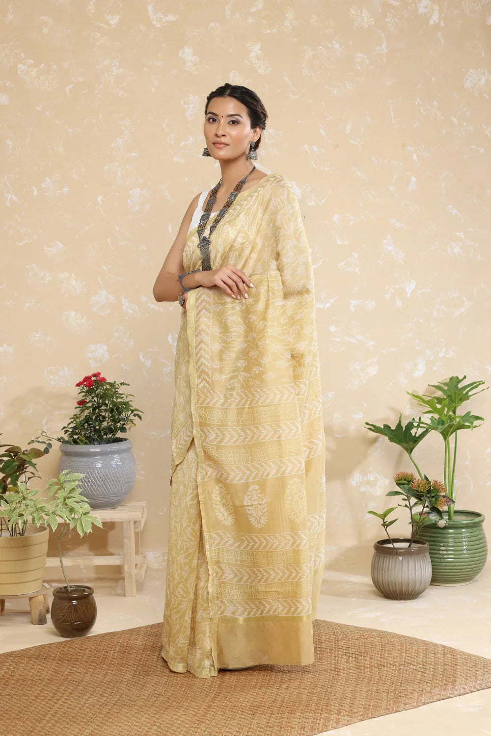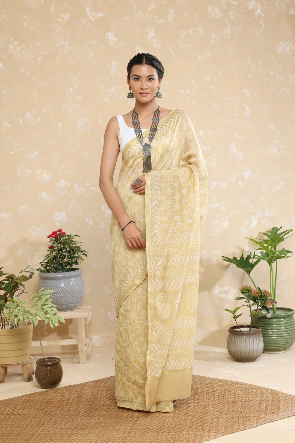 Handloom Coffee Cream Block Print Chanderi Cotton Saree