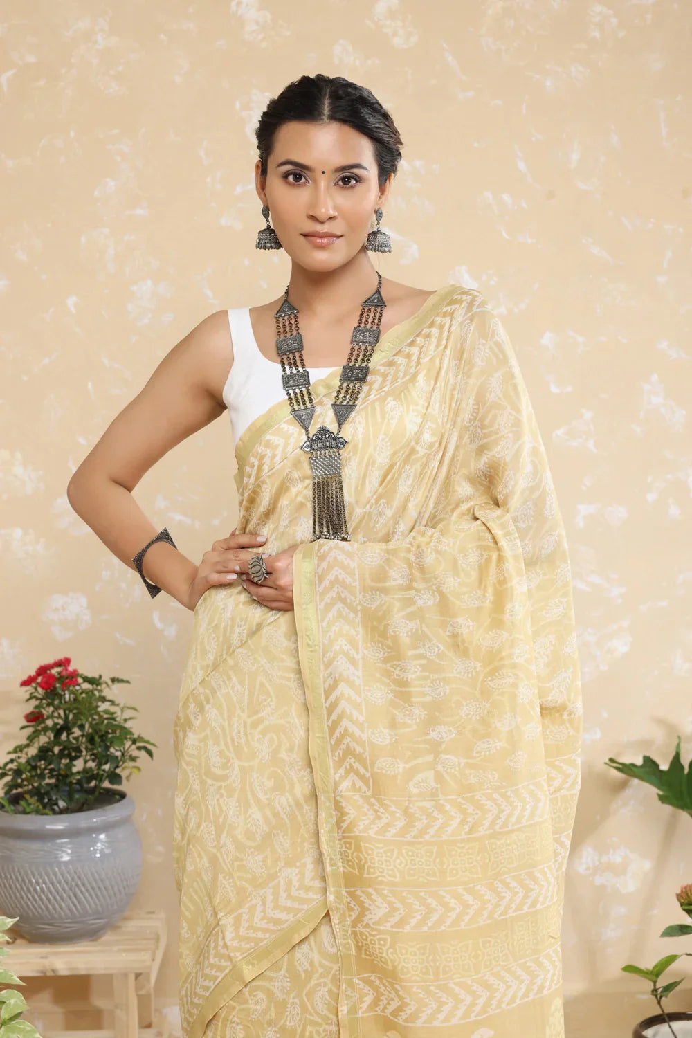 Handloom Coffee Cream Block Print Chanderi Cotton Saree