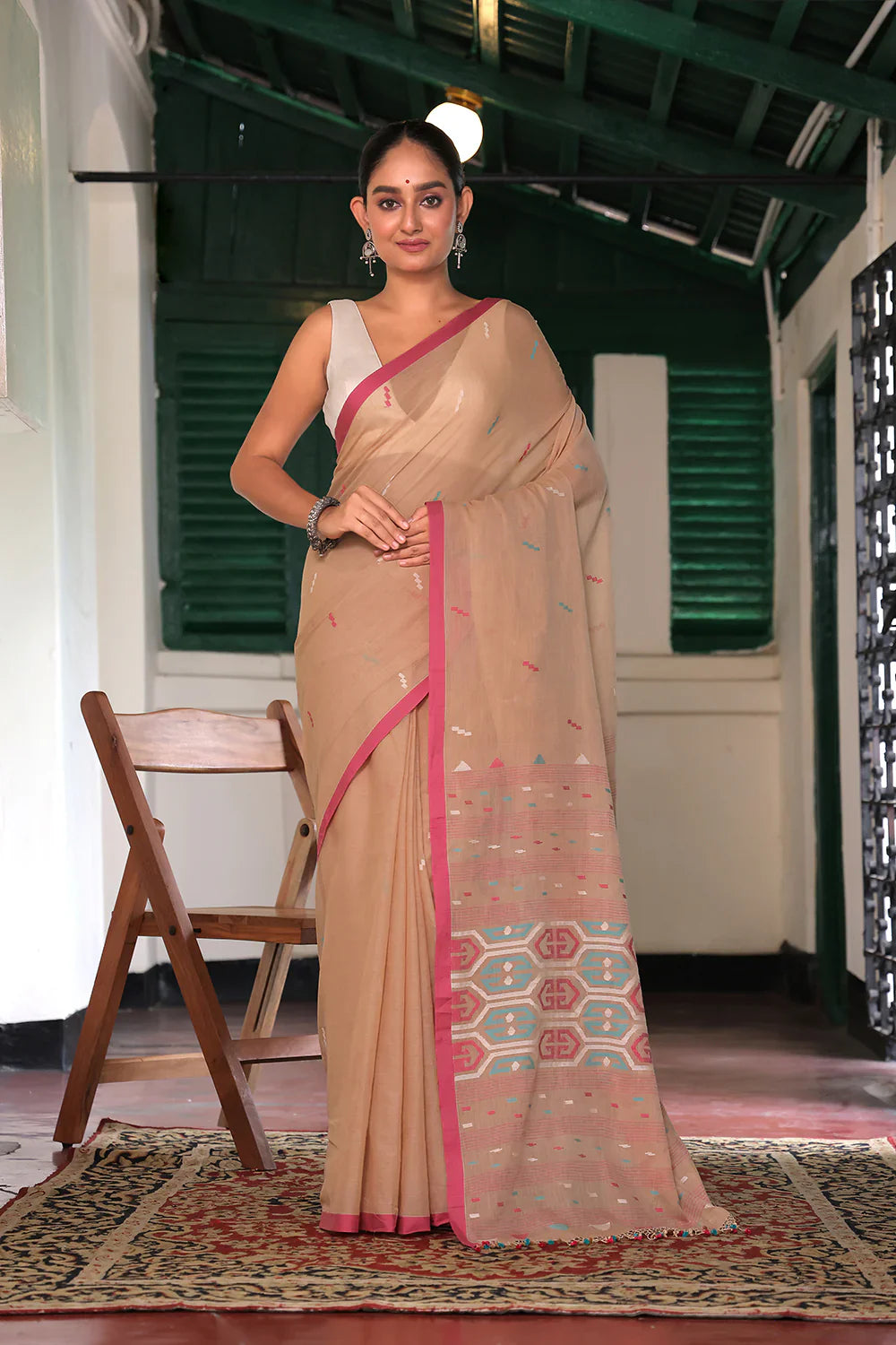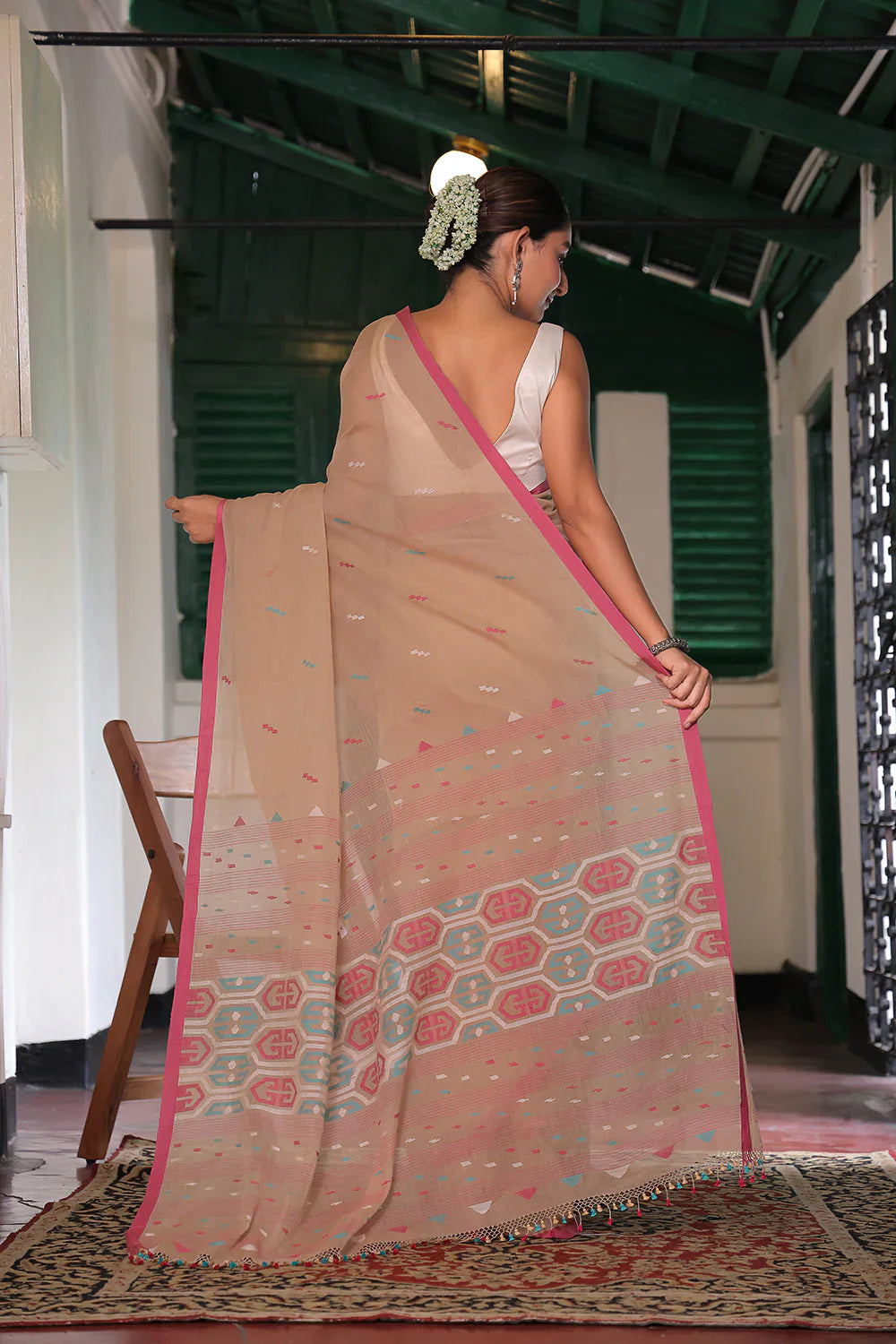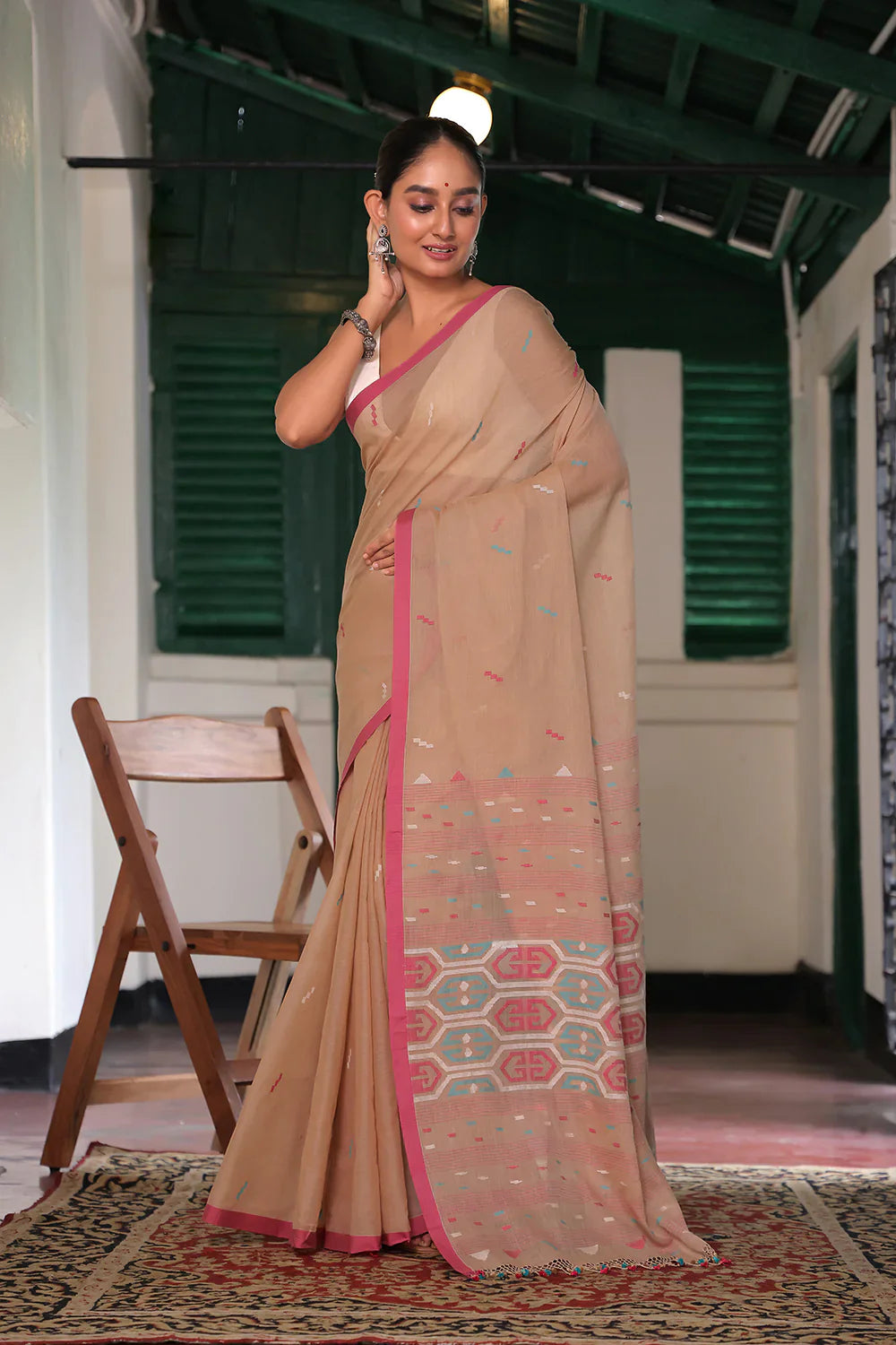 Handloom Cookie Brown Soft Cotton Jamdani Saree