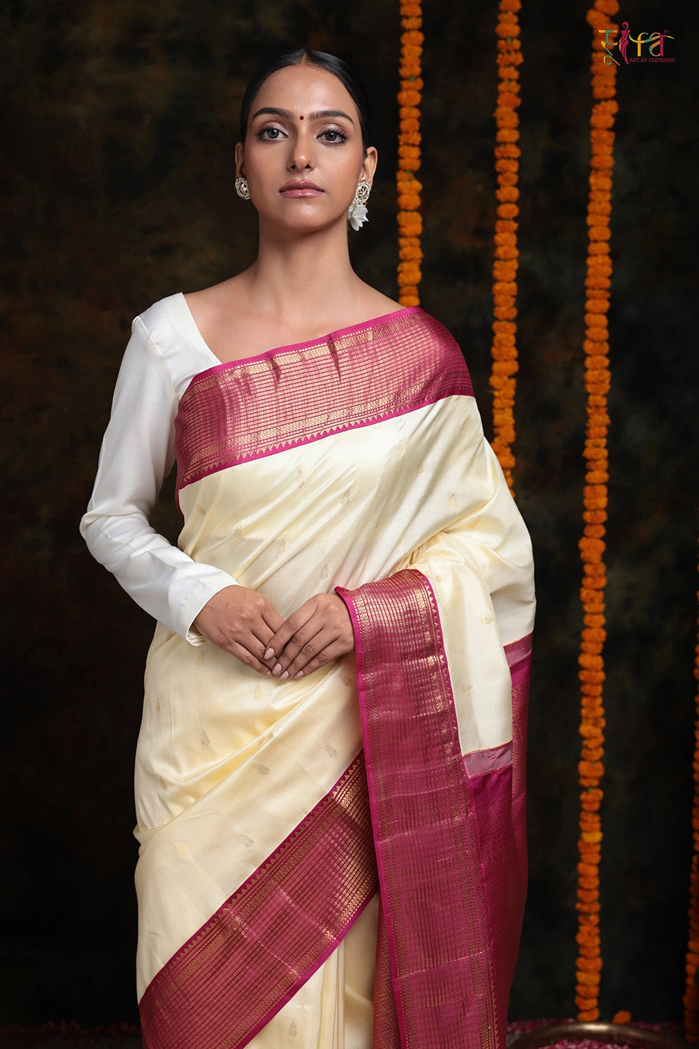 Handloom Cream Kanchipattu With Hot Pink Golden Zari Border