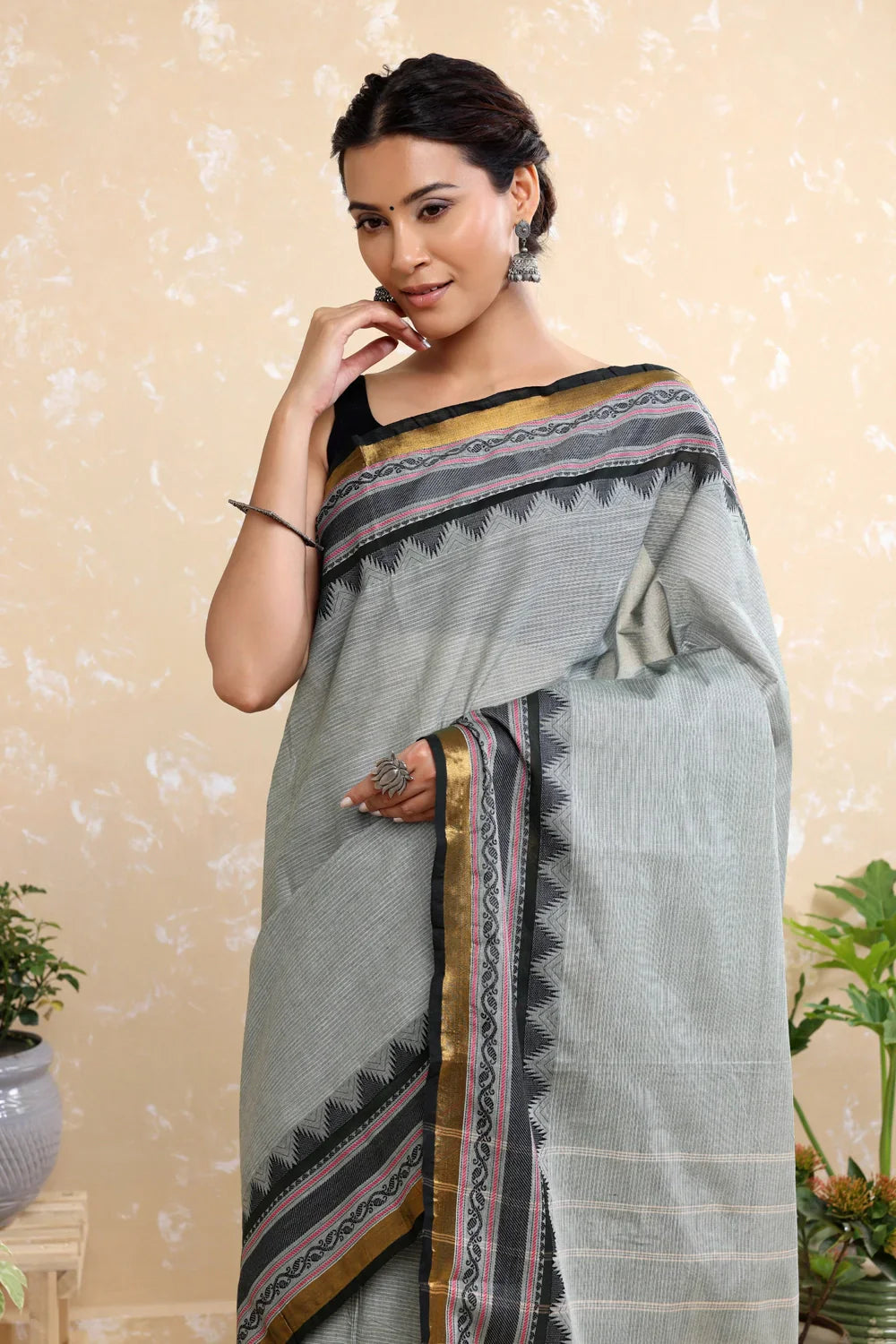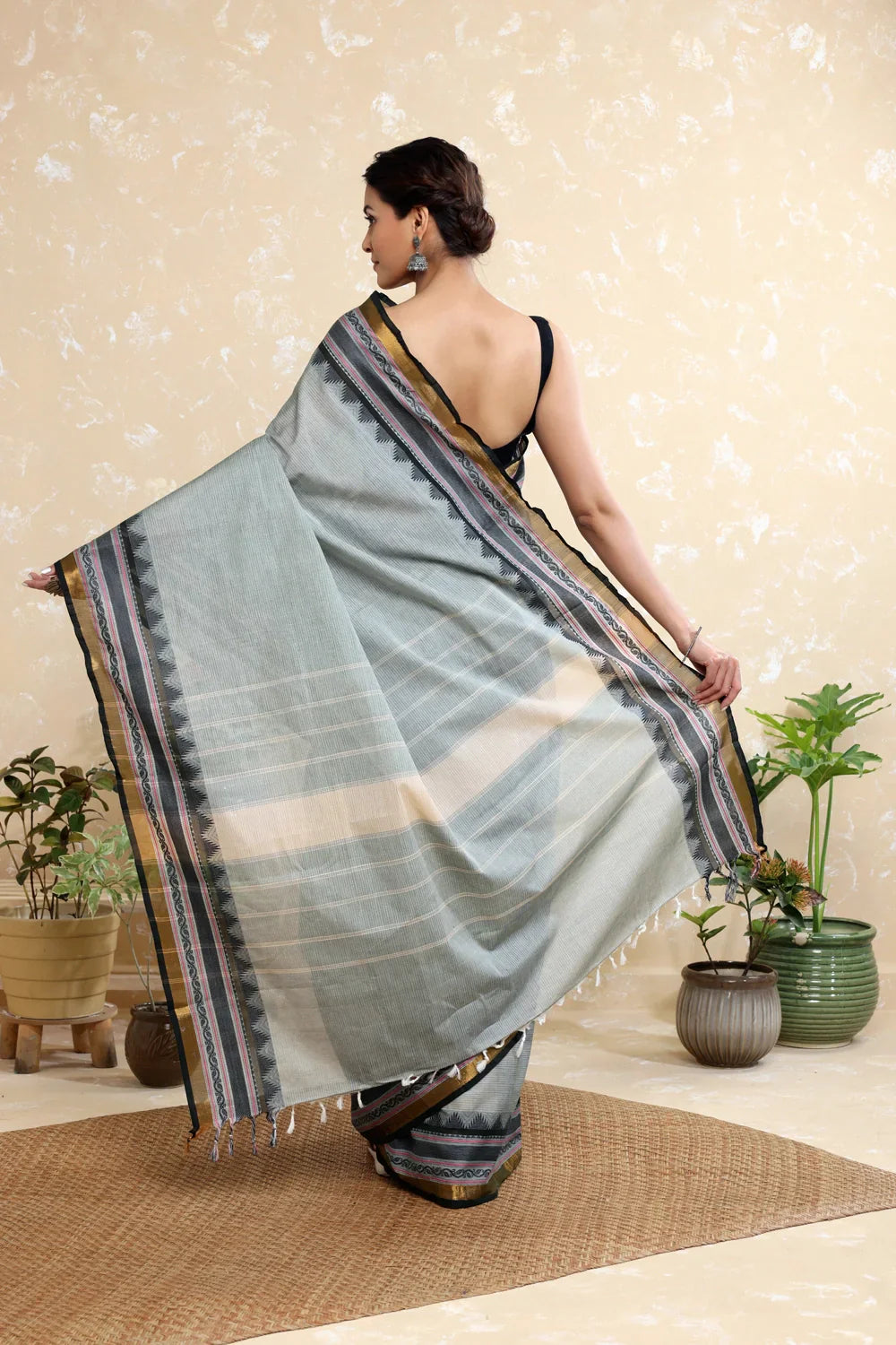 Handloom Grey Pure Cotton Kanchi Saree With Temple Border