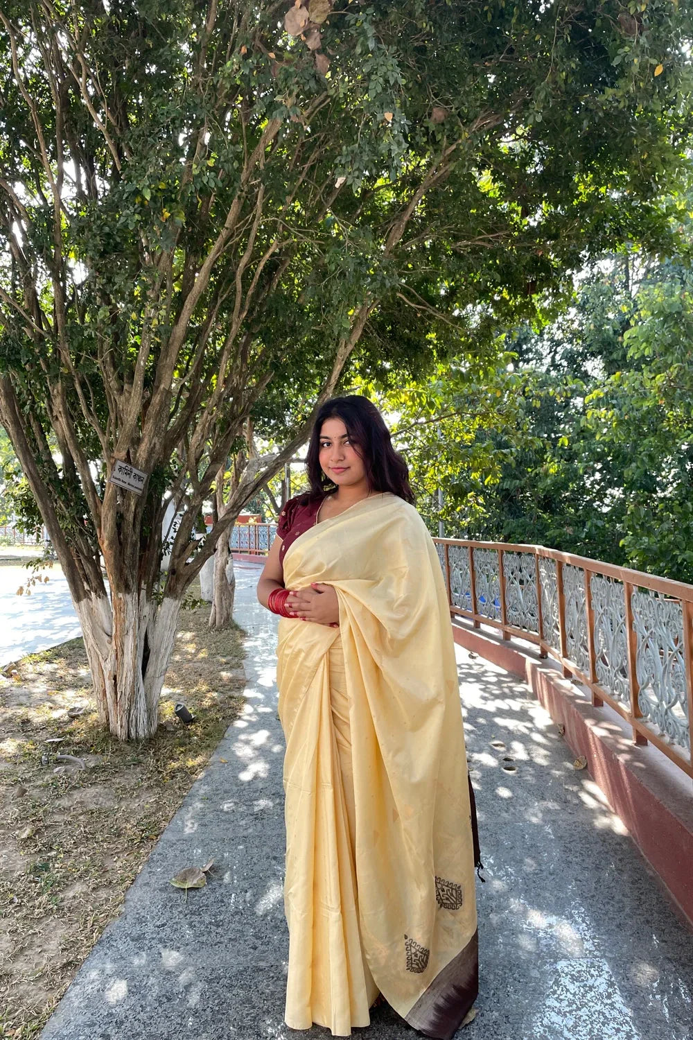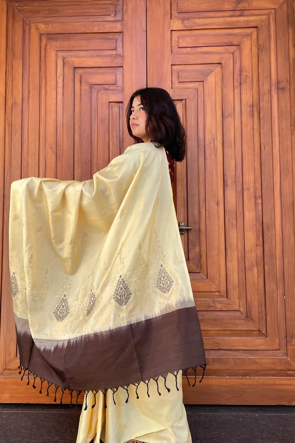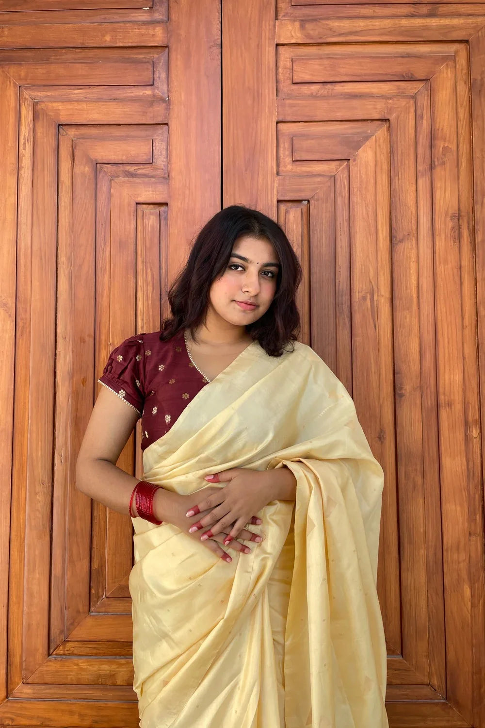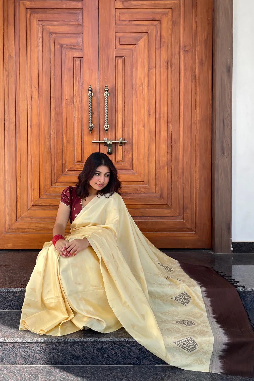 Discover timeless elegance with our Handloom Cream Pure Silk Kanchipattu Saree. The rich chocolate brown Gold Zari Pallu and intricate choti booti weave with gold zari throughout create a mesmerizing tapestry of tradition and sophistication. Crafted to perfection, this saree is a celebration of artistry, making it an ideal choice for special occasions. Embrace the luxurious feel of pure silk and make a statement with the harmonious blend of cream and chocolate brown, adding a touch of opulence to your ethnic wardrobe. Elevate your style with this exquisite piece that epitomizes grace and charm.