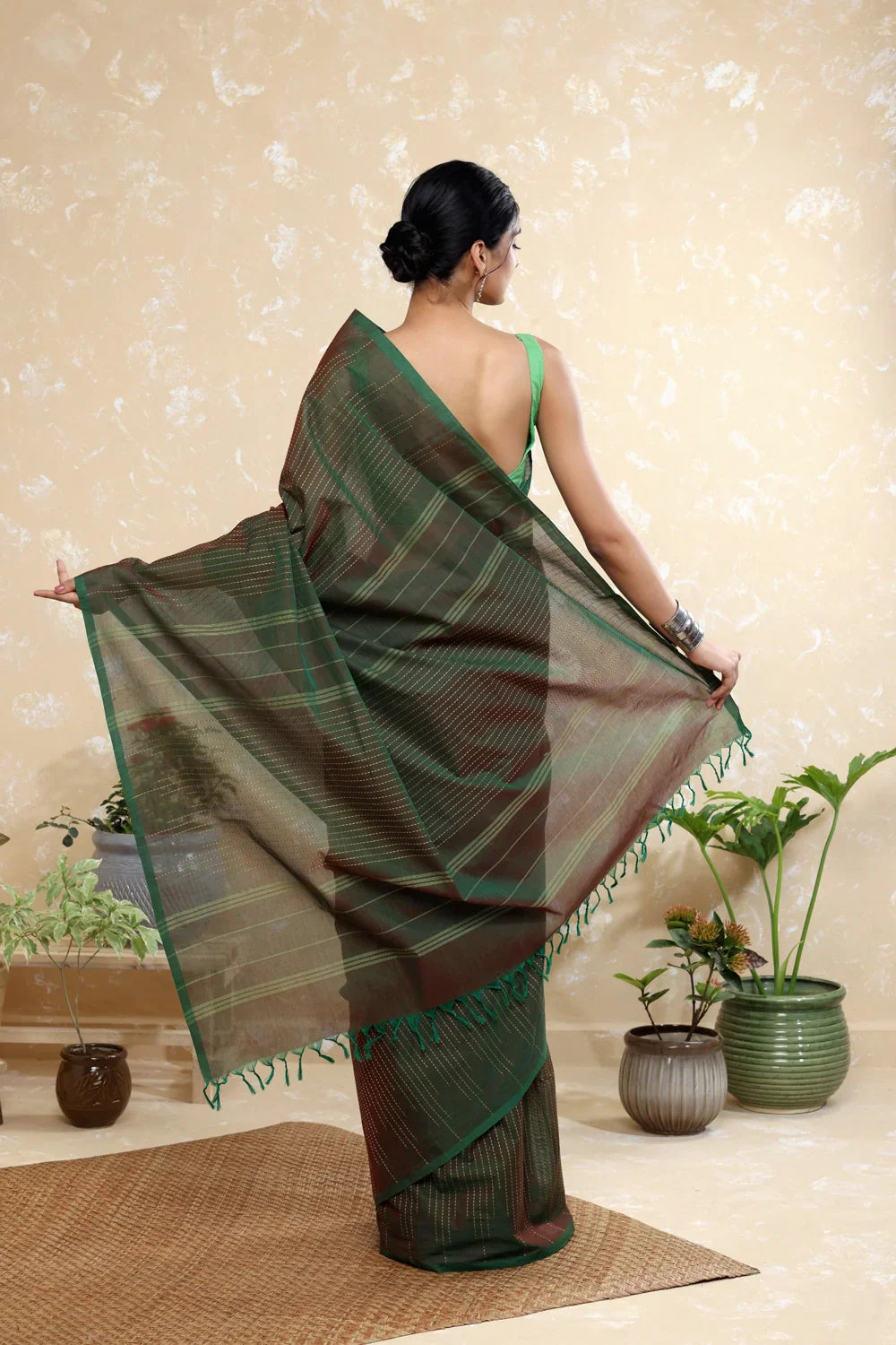 Handloom Dark Green Pure Cotton Kanchi Saree with Beige Stripes